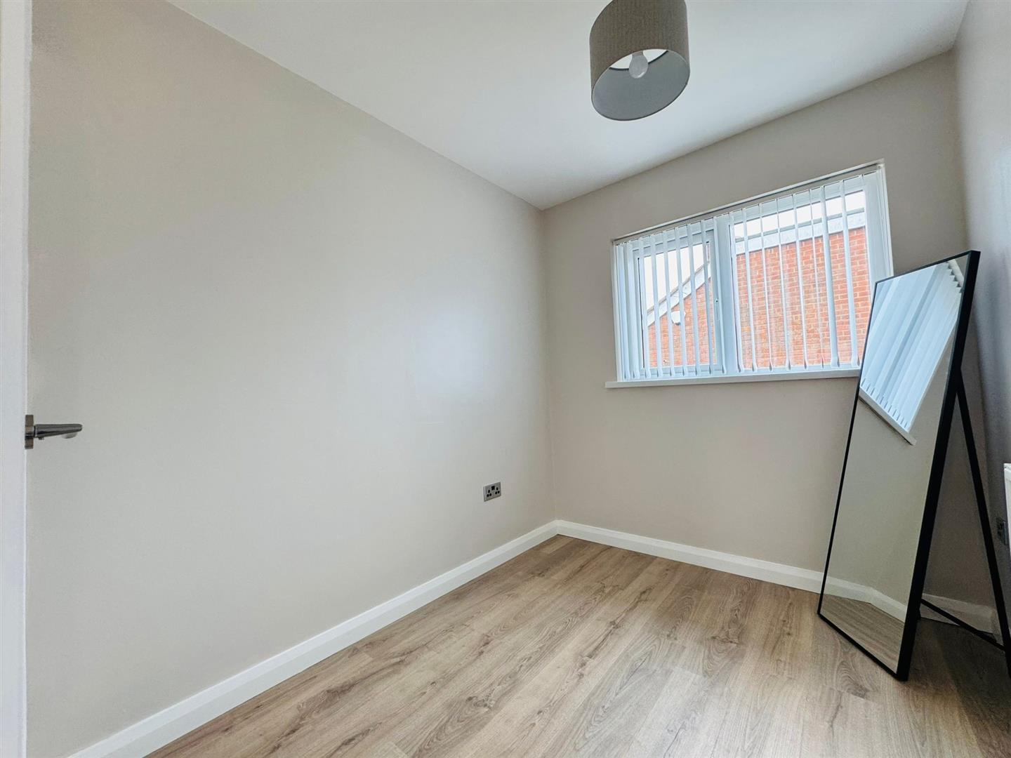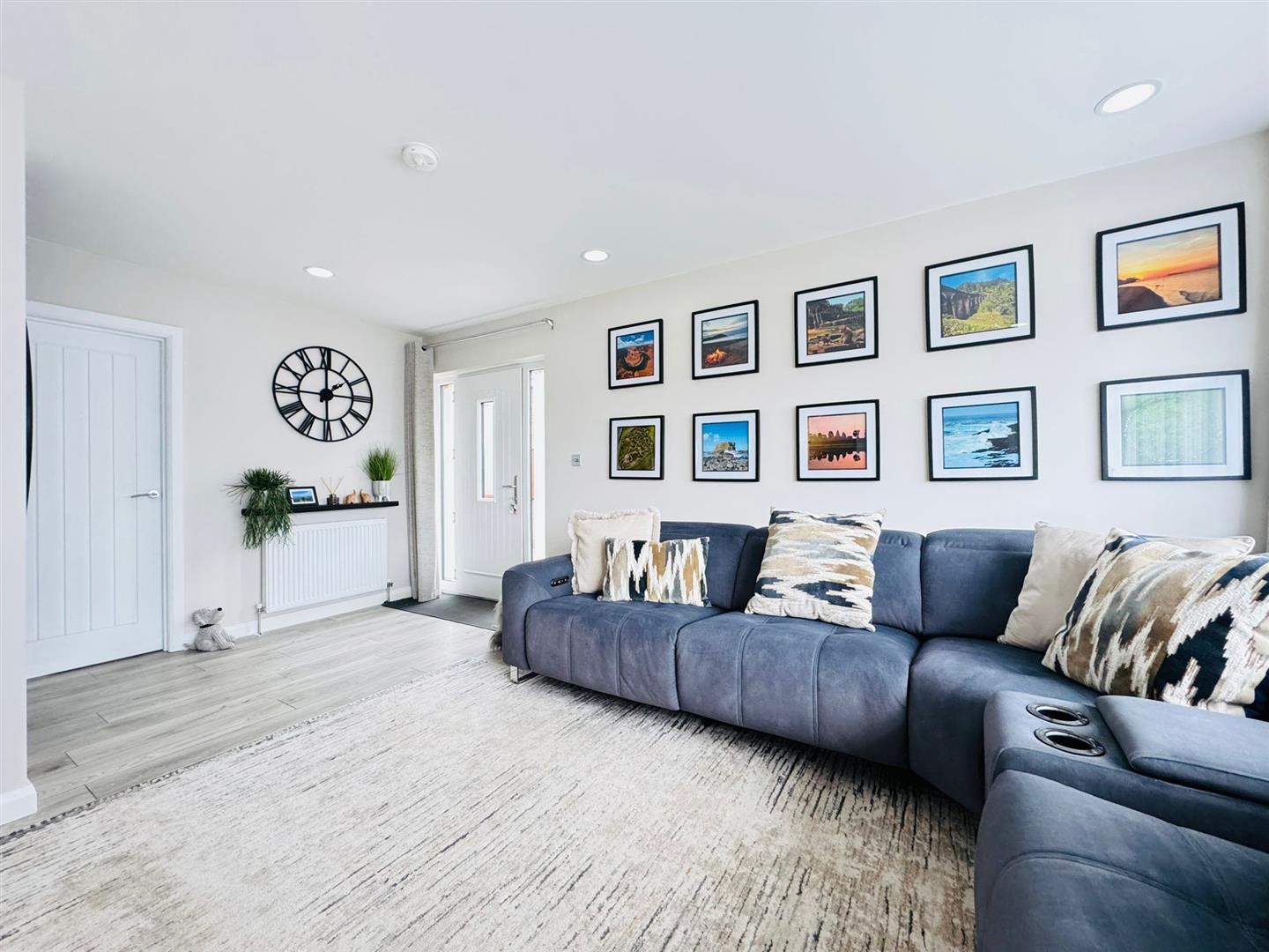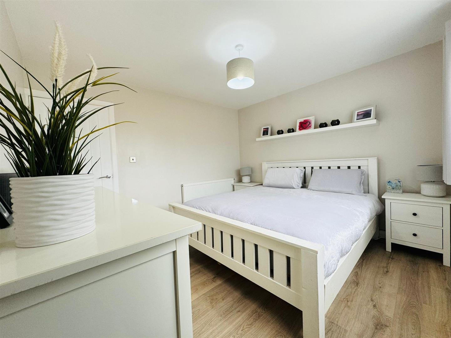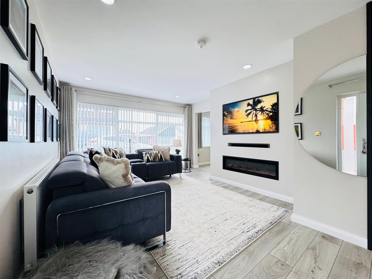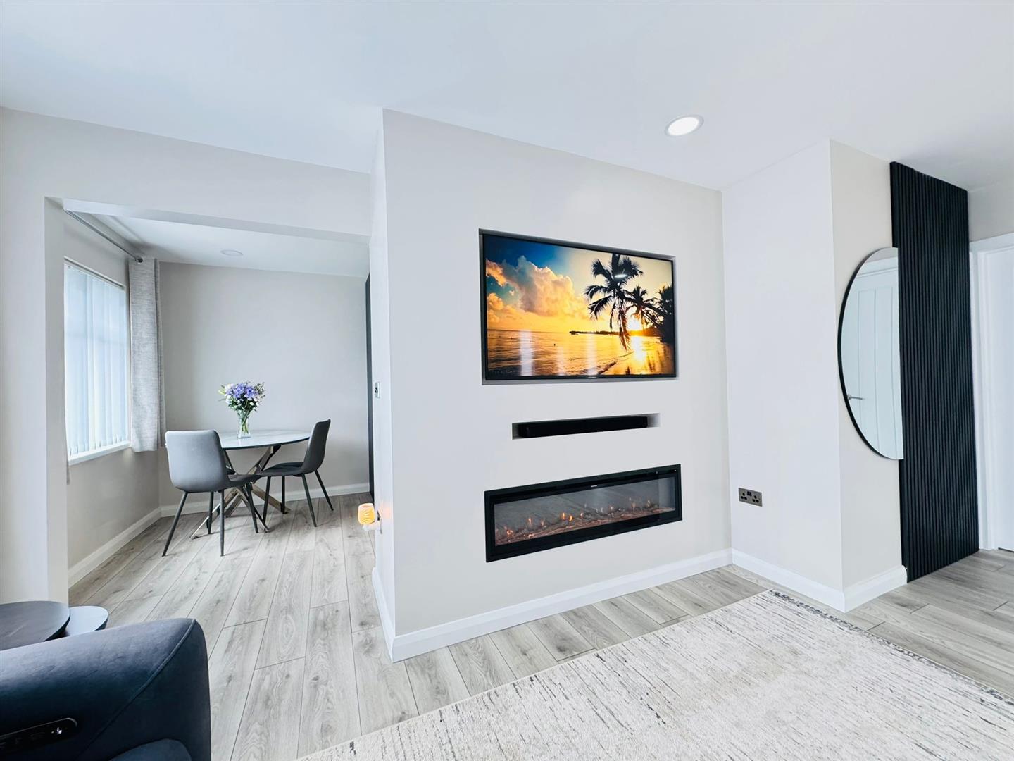 Feature wall mounted fireplace, wood laminate flooring, radiator, storage cupboard