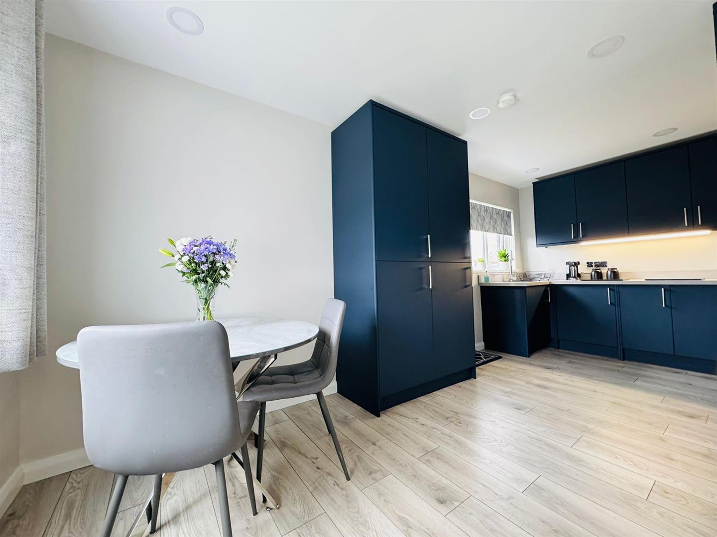 Inside the accommodation comprises; entrance open into lounge with feature media wall with inset electric fire, wood laminate flooring and open to a recently installed modern fitted kitchen / diner with built in oven & hob, integrated appliances and access to side.