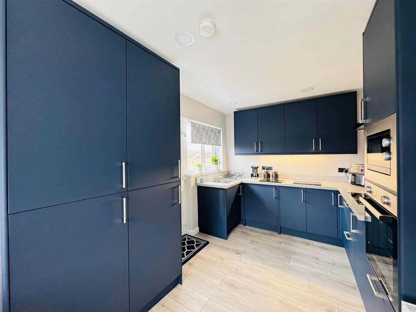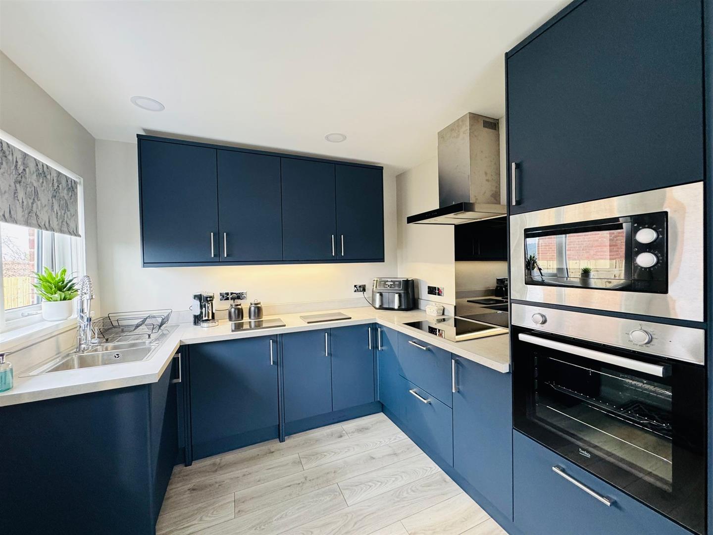 Luxury range of high and low level fitted units with complimentary worktops, and upstands, basin 1/2 stainless steel sink unit, built in stainless steel eye level oven, stainless steel microwave, ceramic hob, extractor fan, integrated fridge / freezer and washing machine, wood laminate flooring, radiator, pvc double glazed side door