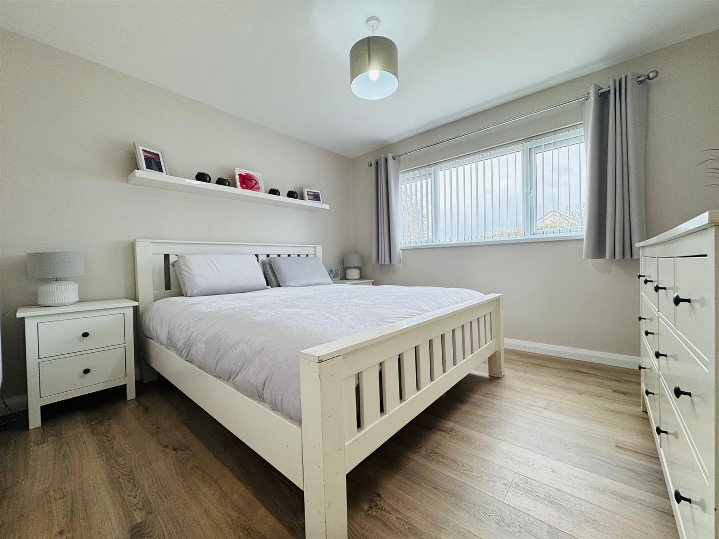 There are also three bedrooms, all with wood laminate flooring and a separate luxury white bathroom