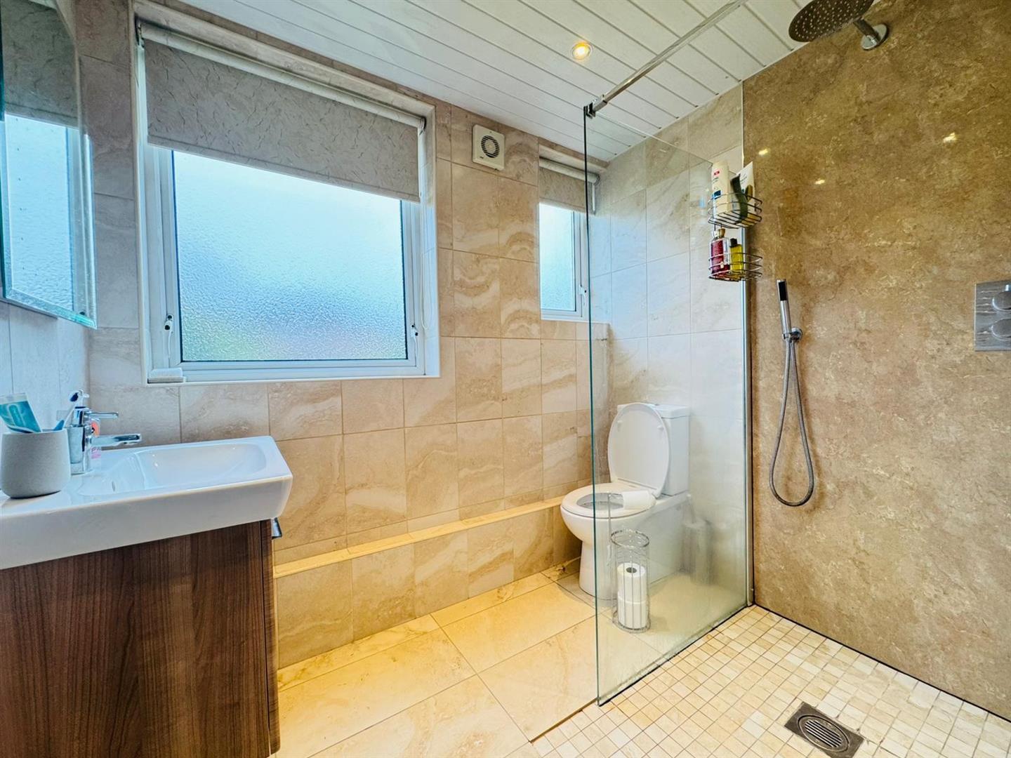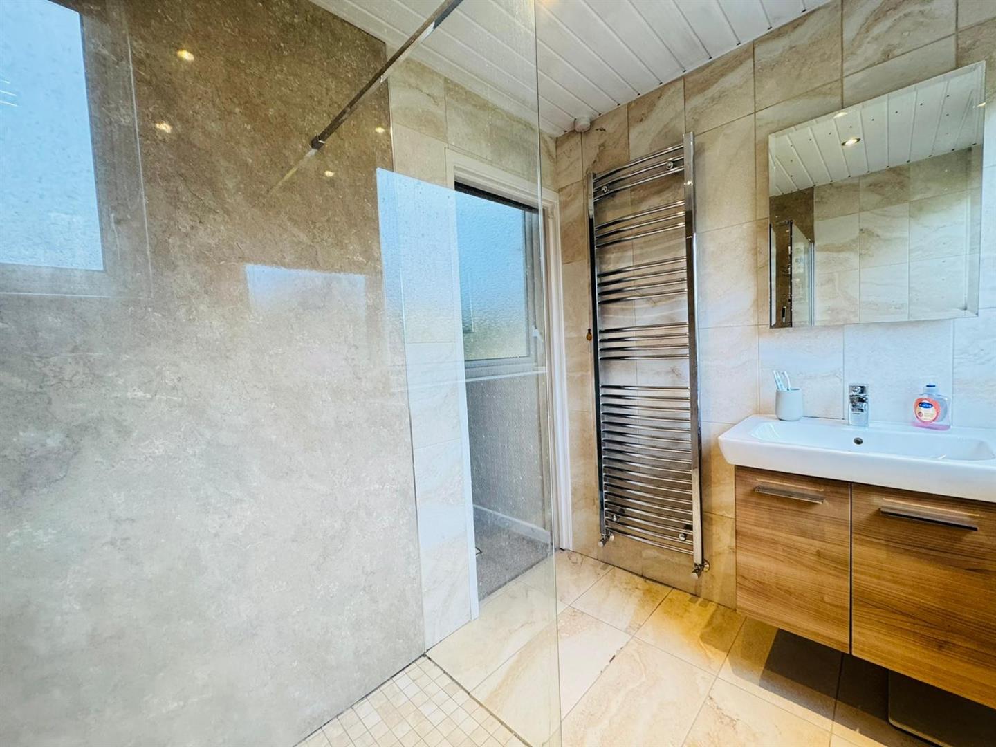 Walk in shower area, thermostatic shower, glass screen, floating vanity unit, low flush wc, partly tiled walls, tiled floor, chrome heated towel radiator
