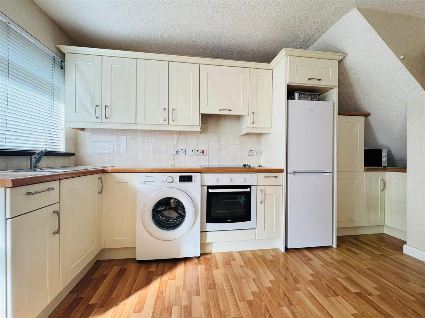 Modern range of high and low level units, formica worktops, stainless steel single drainer sink unit, built in oven, ceramic hob, extractor fan, fridge / freezer space, plumbed for washing machine, partly tiled walls, wood laminate flooring, radiator, pvc double glazed back door