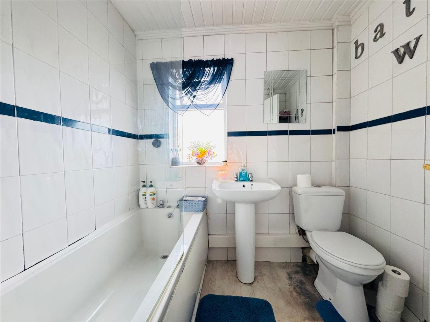 White suite comprising panelled bath, electric shower above, screen, pedestal wash hand basin, low flush wc, fully tiled walls, radiator