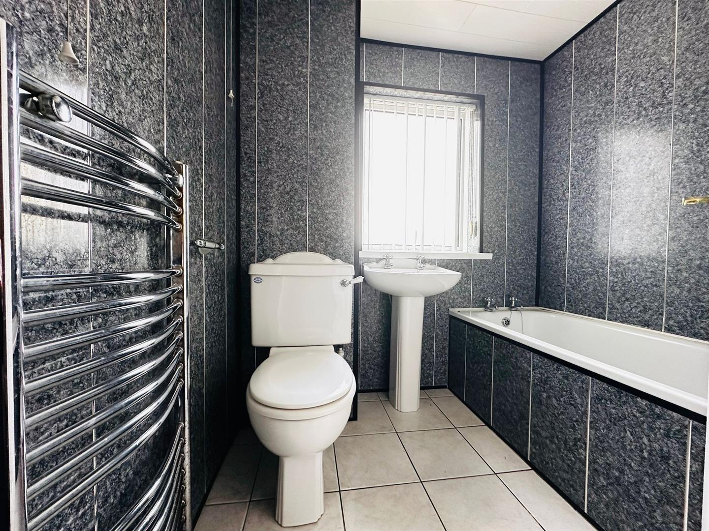 White suite comprising: pvc panelled bath with Triton shower above and screen, pedestal wash hand basin, low flush W.C. Fully pvc panelled walls, tiled floor, chrome heated towel rail.