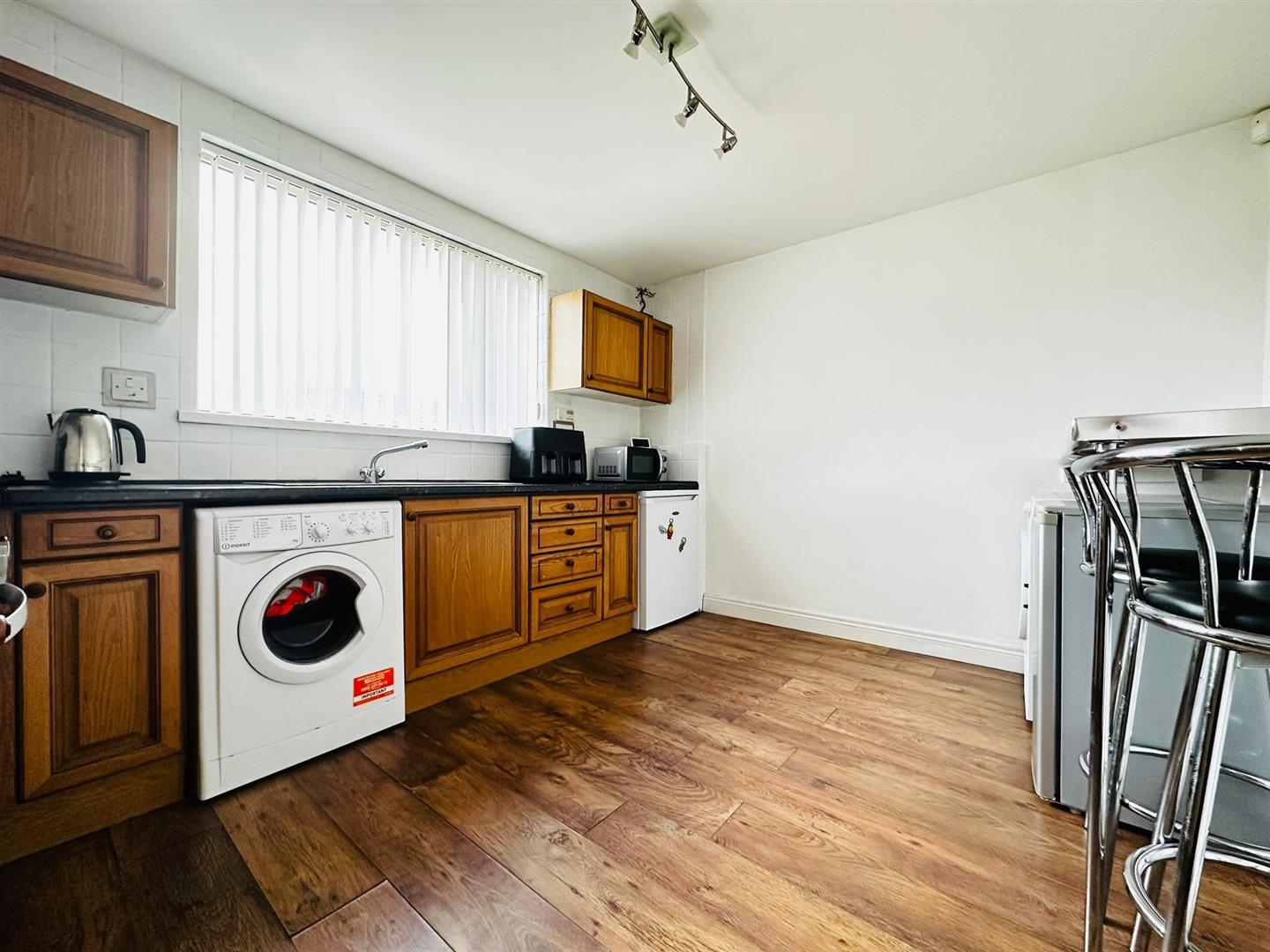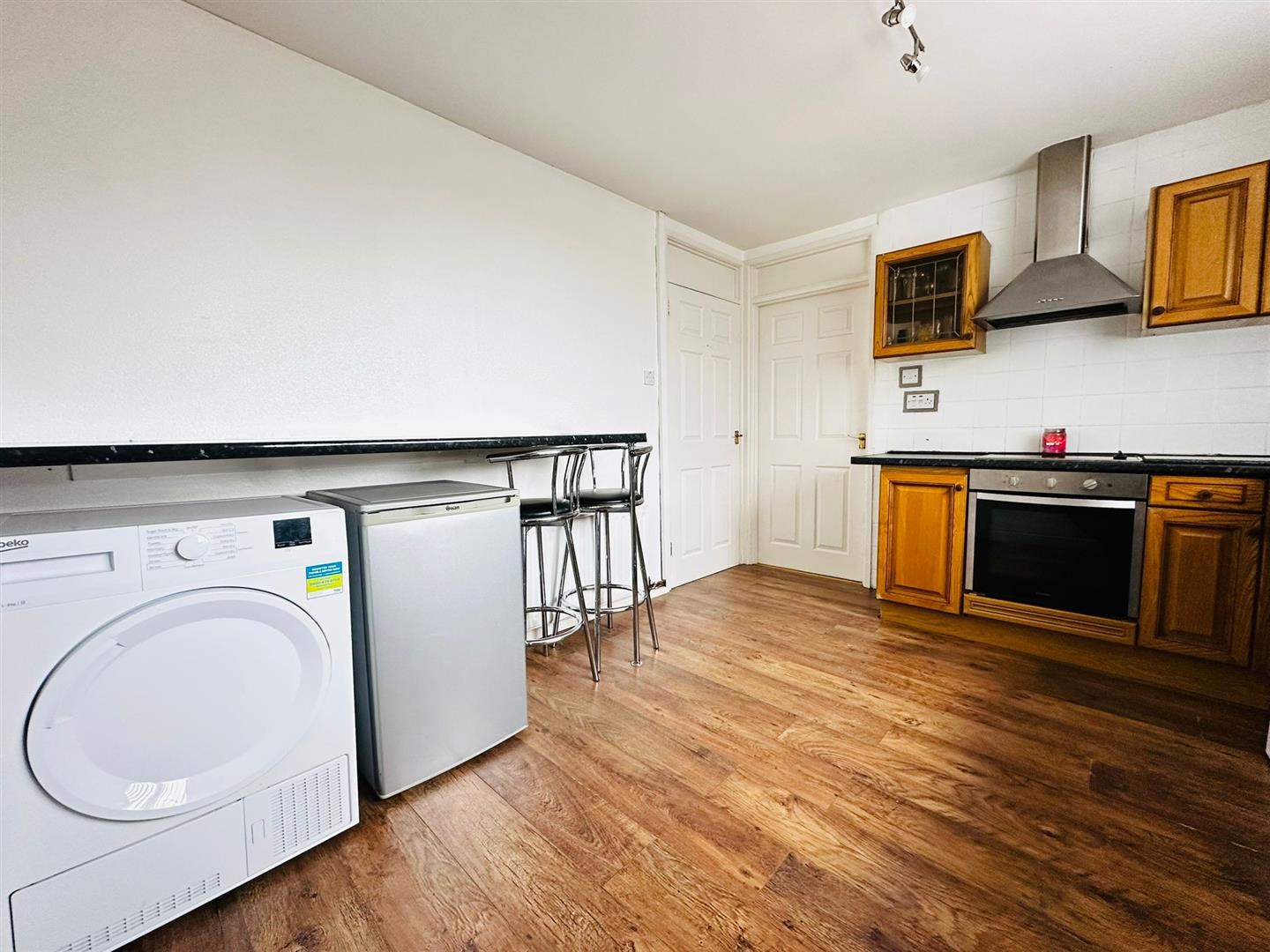Range of high and low level fitted units with Formica worktops, built in stainless steel under oven, ceramic hob and stainless steel extractor fan. Stainless steel single drainer sink unit, plumbed for washing machine, under fridge & freezer space, partly tiled walls, wood laminate flooring, radiator.