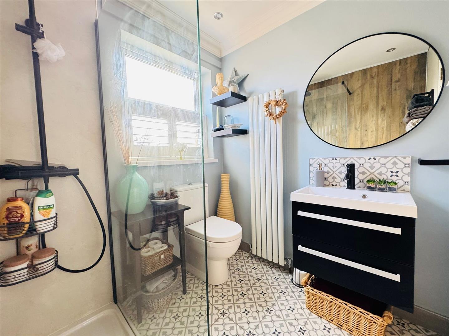 Walk in shower area, thermostatic shower, screen, floating vanity unit, low flush wc, tiled floor, modern vertical radiator