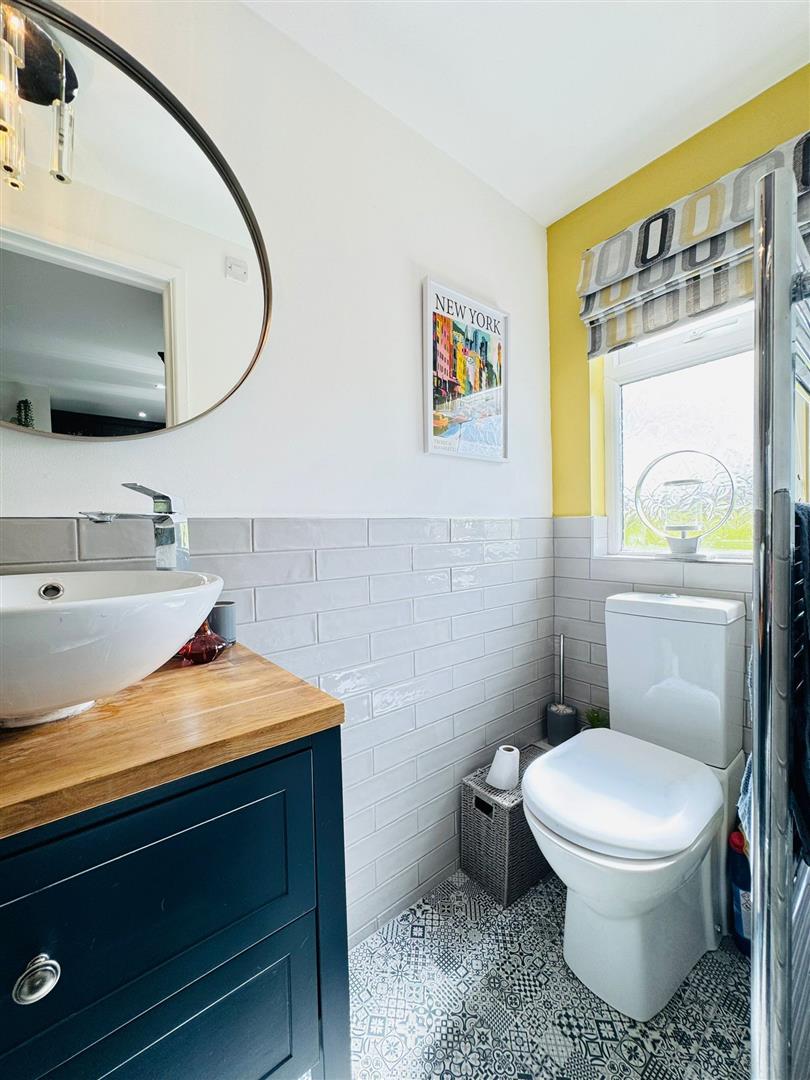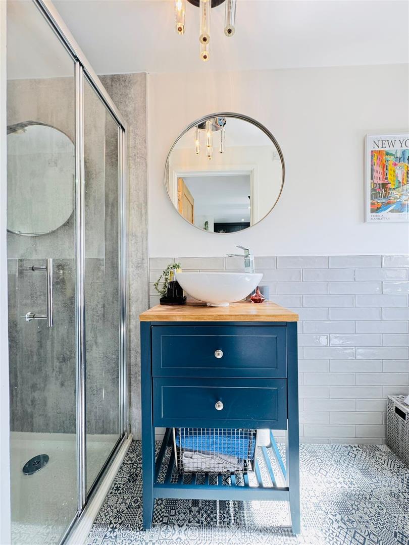 Shower cubicle, thermostatic shower, feature wash hand basin on storage unit, low flush wc, partly tiled walls, chrome heated towel radiator