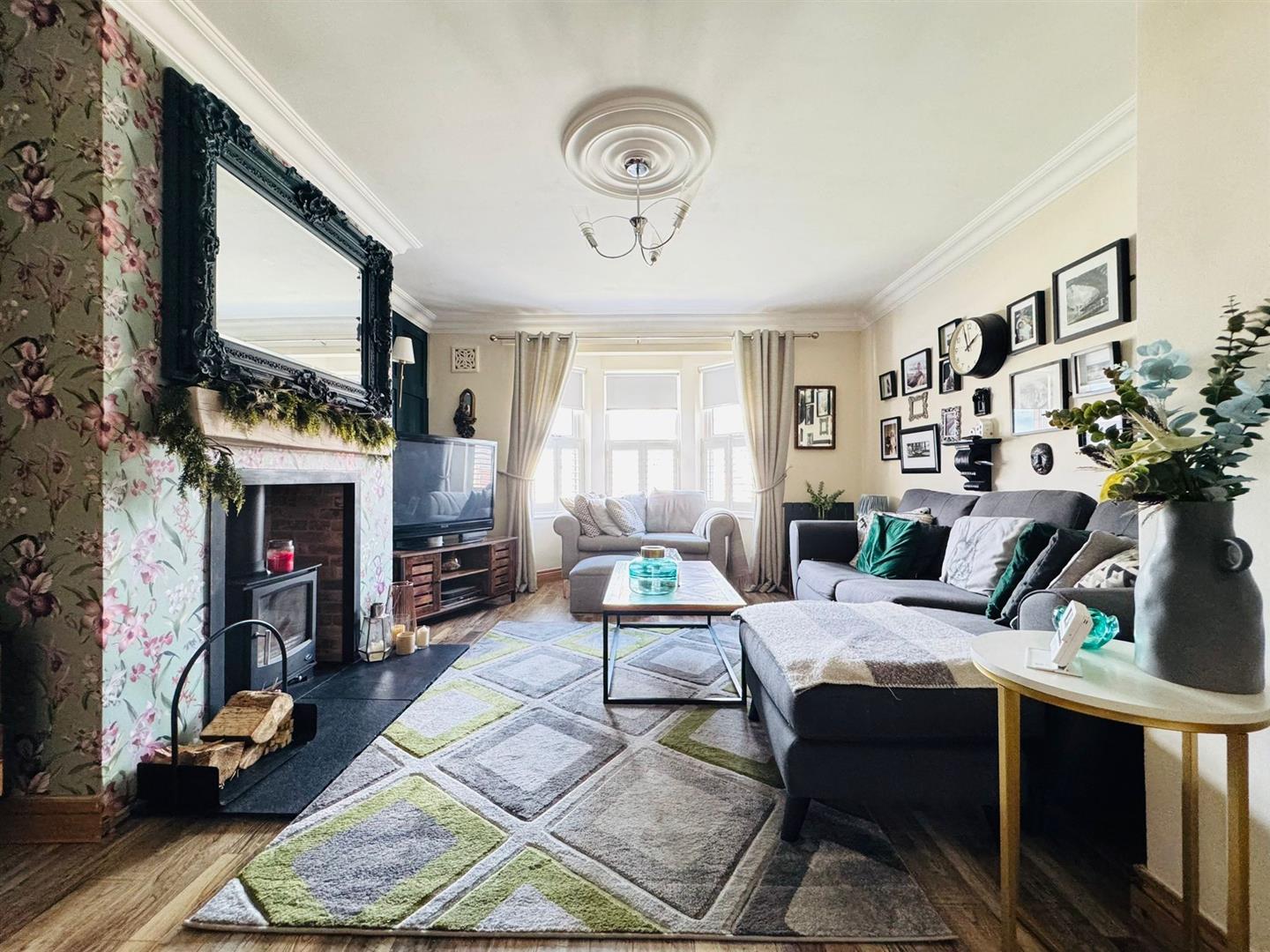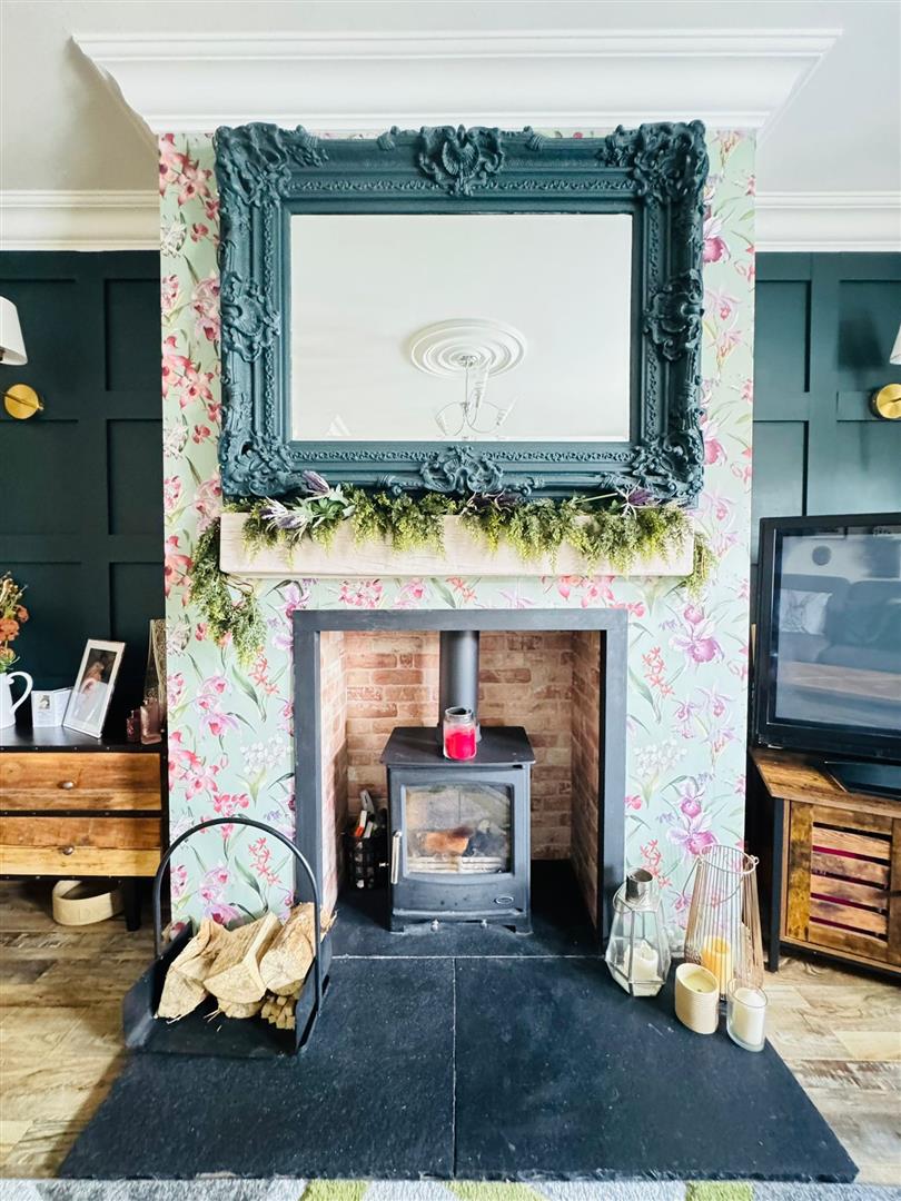 Feature hole in wall style fireplace with multi fuel burning stove, slate hearth, wood laminate flooring, two modern vertical radiator