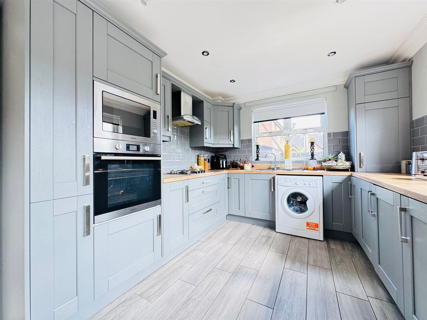 Modern range of high and low level units, formica worktop, stainless steel single drainer sink unit, built in stainless steel oven, stainless steel microwave, stainless steel gas hob, stainless steel extractor fan, fridge / freezer space, plumbed for washing machine, tumble dryer space, partly tiled walls, tiled floor, modern vertical radiator, pvc double glazed door to rear