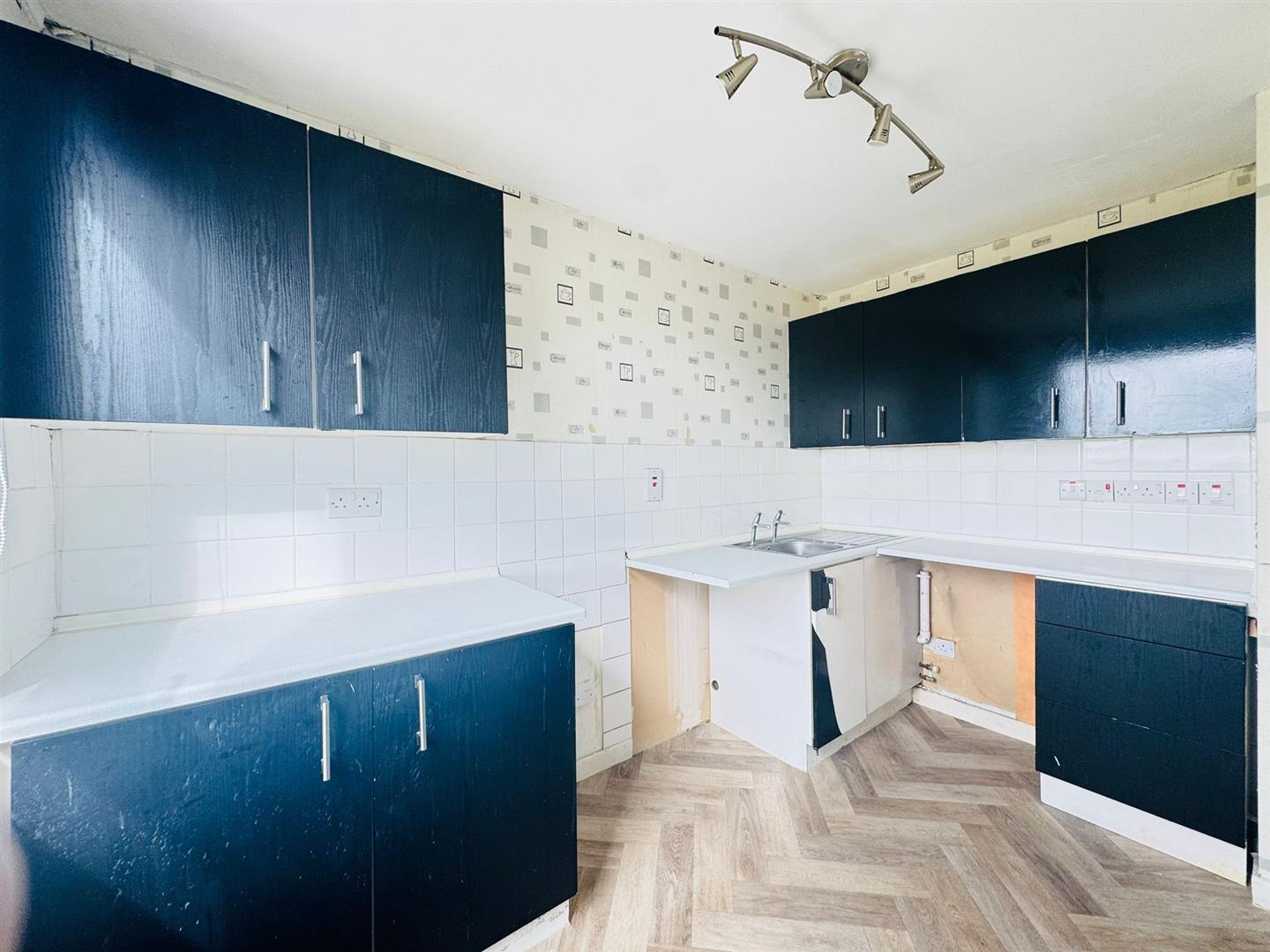 Range of high and low level units, formica worktop, stainless steel single drainer sink unit, cooker space, under fridge & freezer space, partly tiled walls