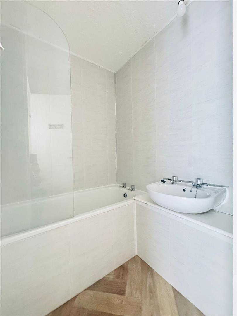 Modern white suite comprising bath, electric shower above, screen, wash hand basin, part pvc panelled walls