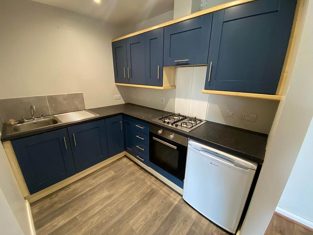 Navy Shaker Style fitted kitchen with new built in gas hob, oven and extractor fan and fridge freezer.