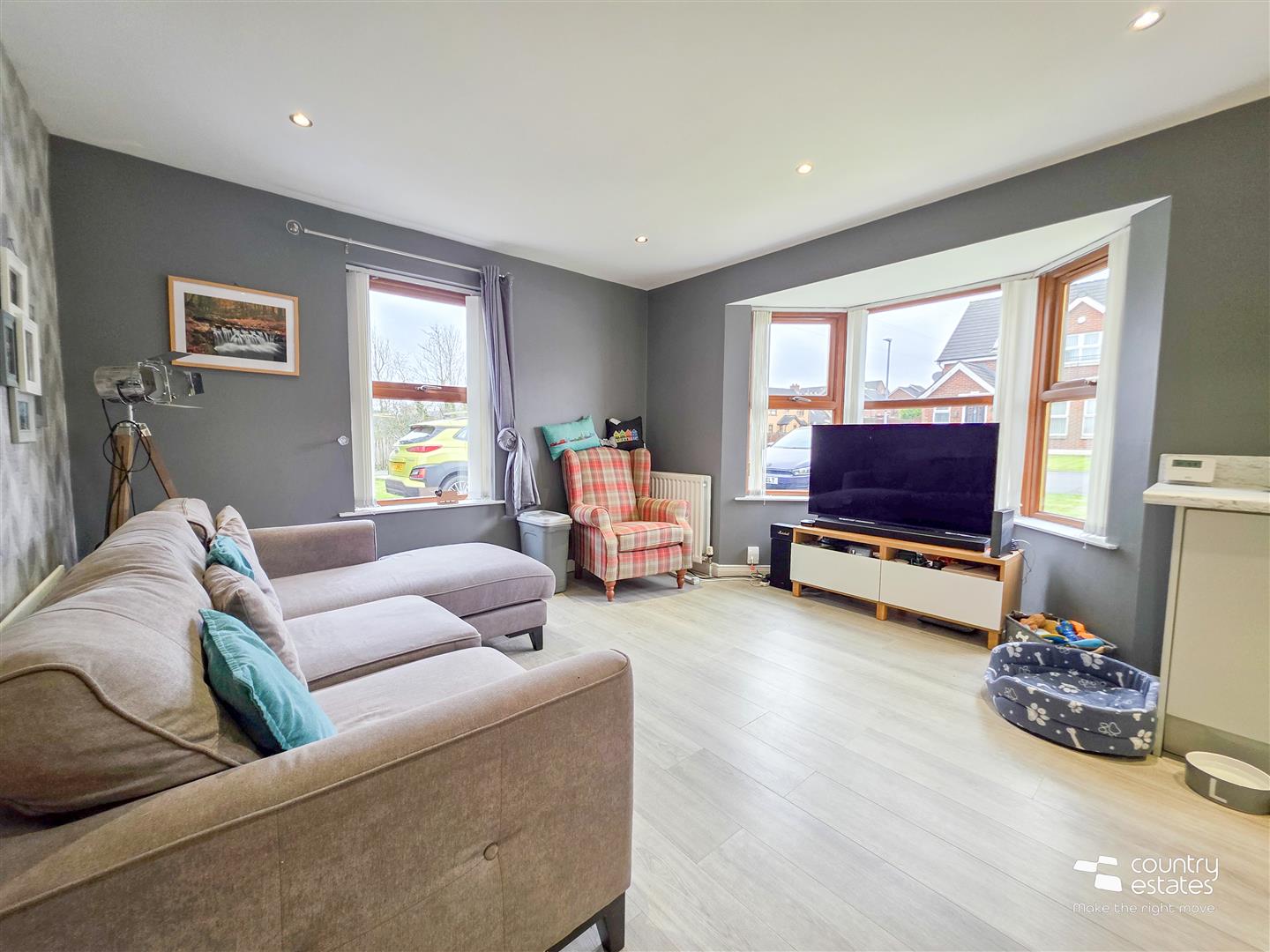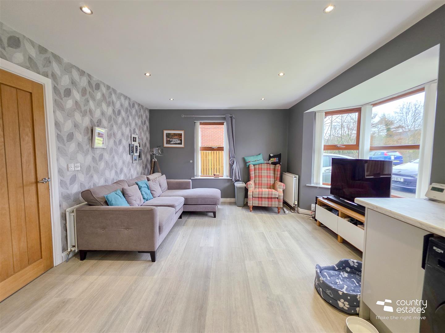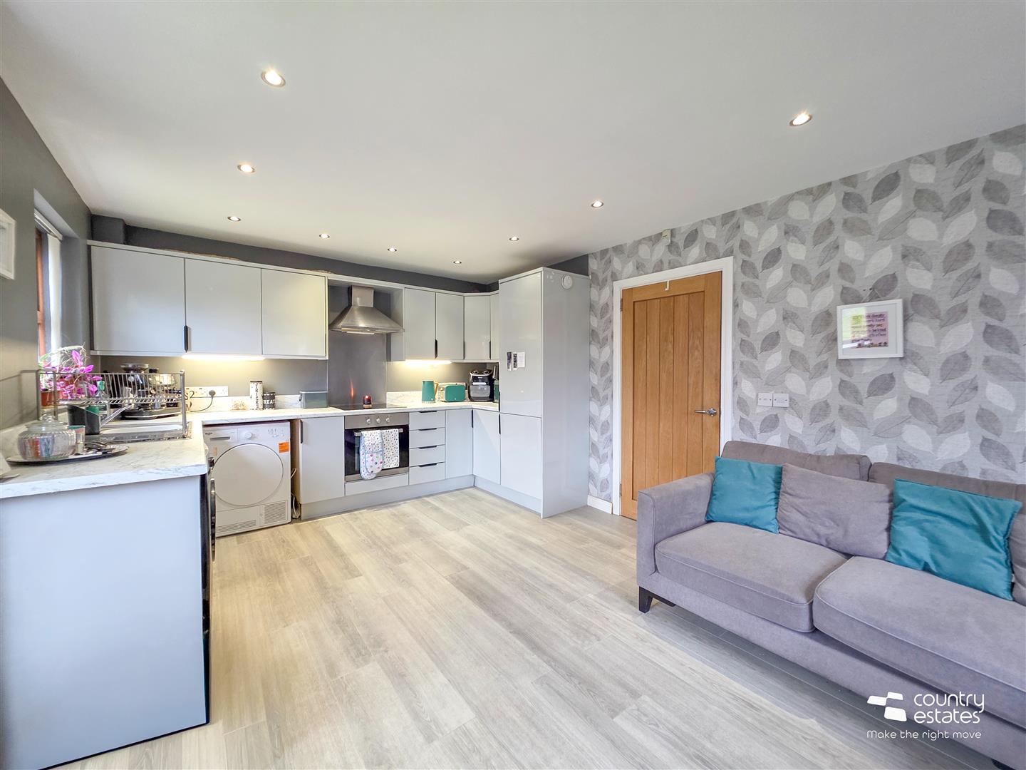 Feature bay window. Modern fitted kitchen equipped with a comprehensive range of high and low level fitted units with contrasting work surfaces and upstands. One and a half bowl single drainer stainless steel sink unit with monobloc tap. Integrated oven with separate four ring electric hob, overhead extractor fa housed in stainless steel canopy with stainless steel splash back, and an integrated fridge freezer. Plumbed for washing machine. Space for tumble dryer. Quality laminate flooring. Recessed down lighting.