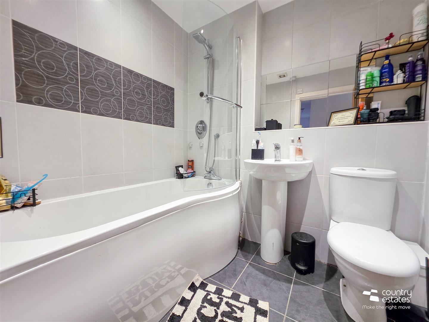 Comprising 'P-shaped' panel bath with fixed shower screen and thermostatic shower over bath, pedestal wash hand basin and a button flush WC. Tiled walls. Tiled floor. Recessed down lighting. Chrome towel radiator.