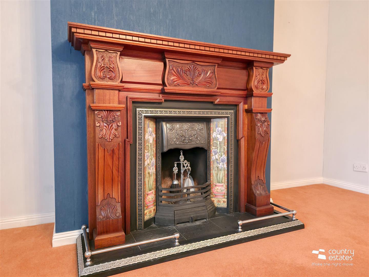 Attractive feature mahogany fireplace with cast iron inset fire and slate hearth. Feature bow window.