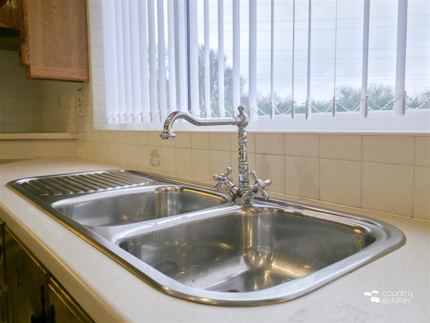 Equipped with high level shaker style fitted units for storage and contrasting work surfaces. Single drainer stainless steel sink unit with mixer tap. Plumbed for washing machine. Space for tumble dryer. PVC double glazed door to rear garden. Service door to Double garage.
