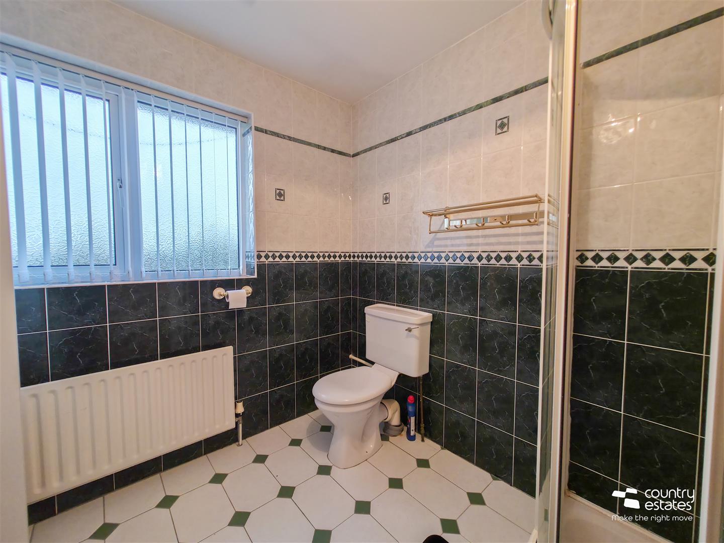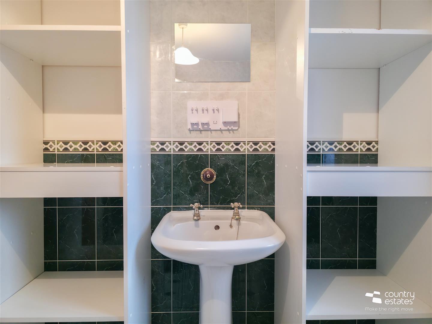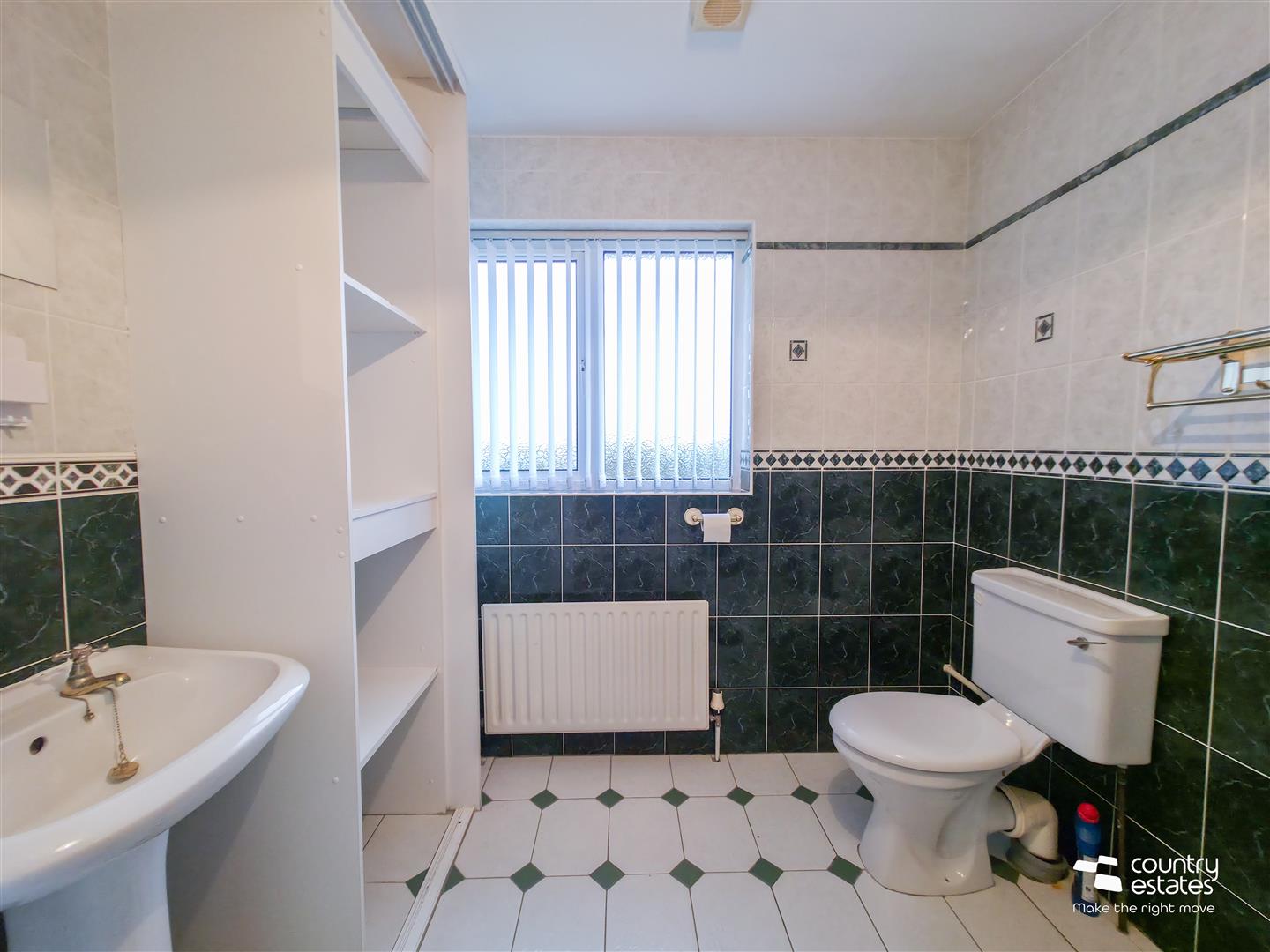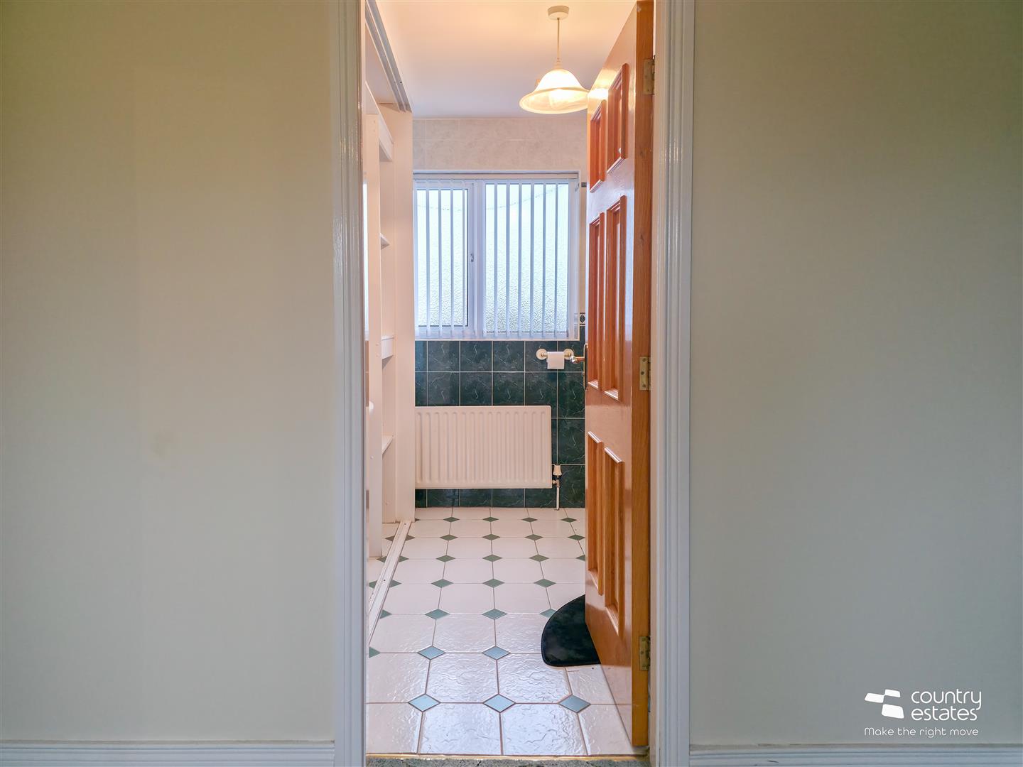 Comprising fully tiled quadrant shower cubicle with electric shower unit, pedestal wash hand basin and a low flush WC. Fitted open shelved storage units.