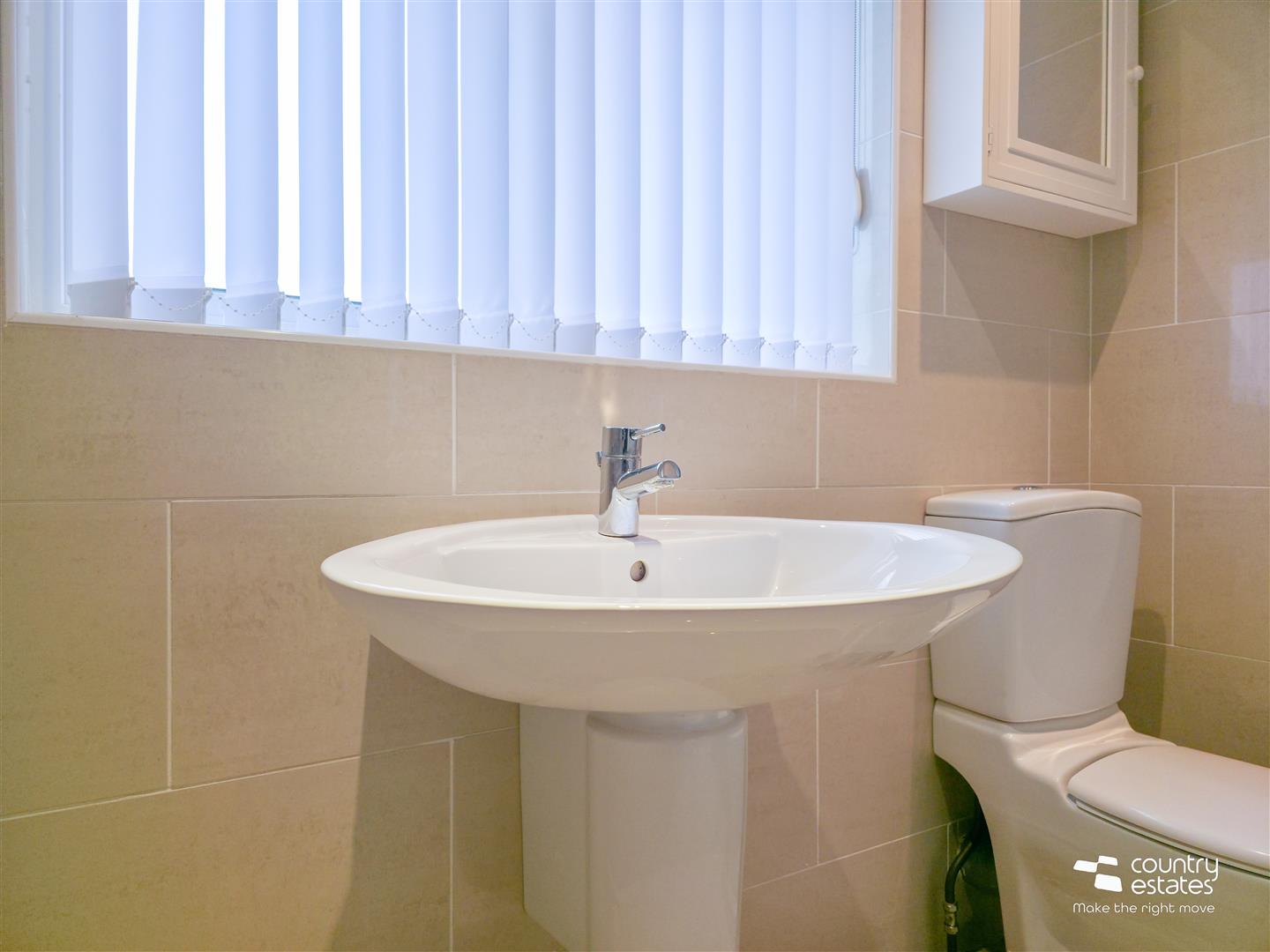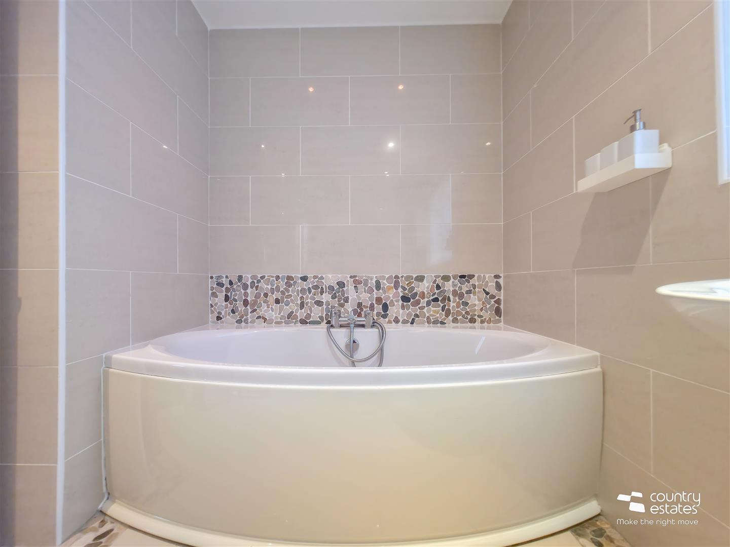 Comprising double ended panel bath with hand shower attachment, quadrant shower cubicle, semi pedestal wash hand basin, and a button flush WC. Chrome towel radiator. Recessed down lighting. Tiled walls. tiled floor.