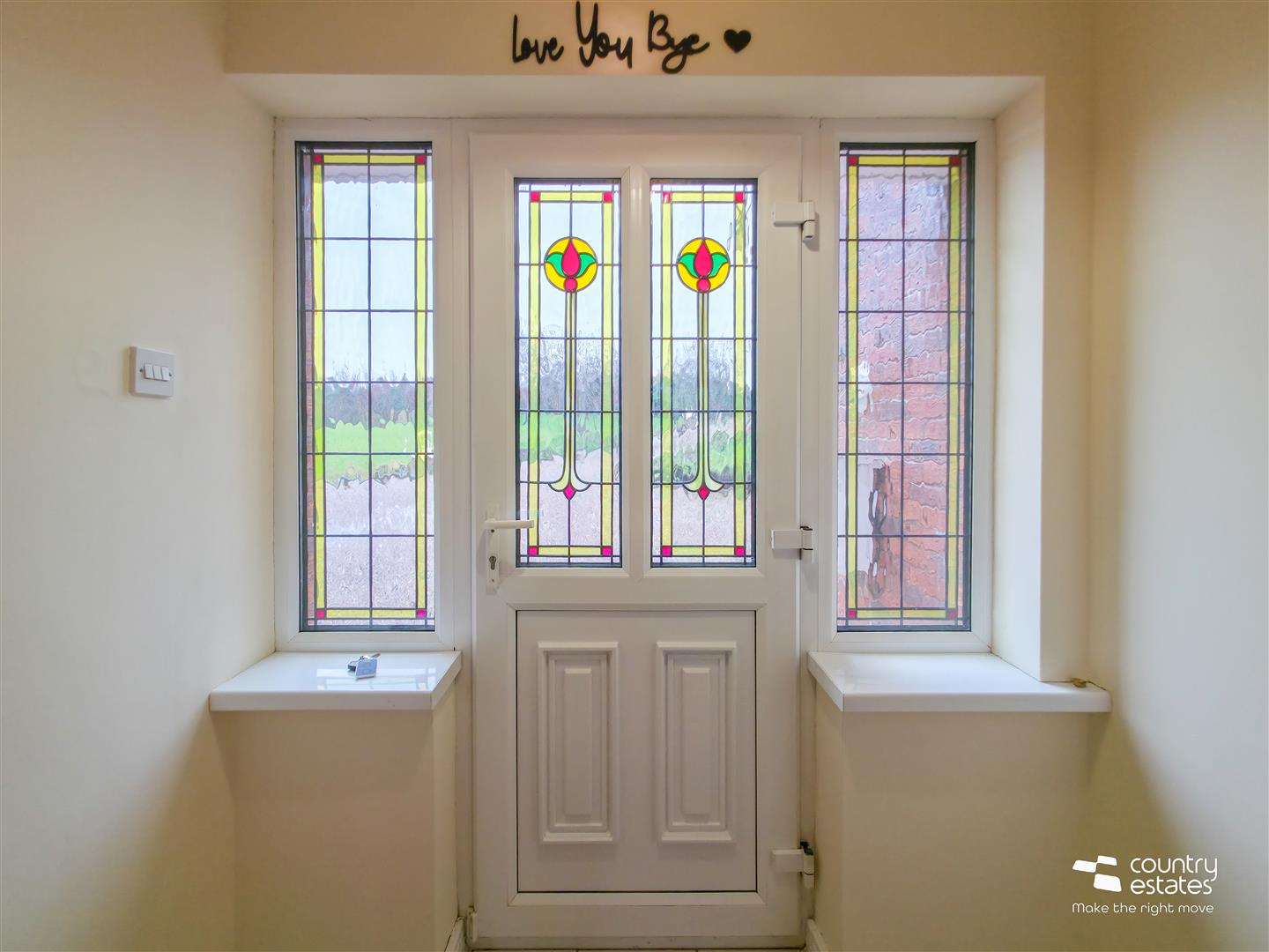 PVC double glazed front door with stained glass insets and matching side screens into entrance porch with tiled floor. Hard wood door and side screens into: