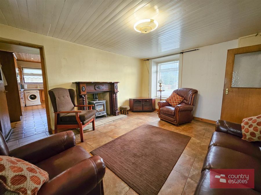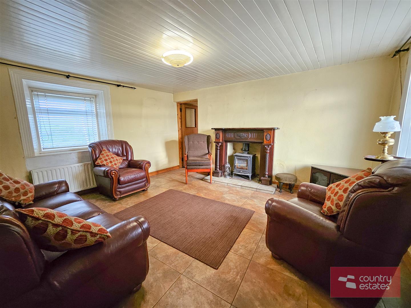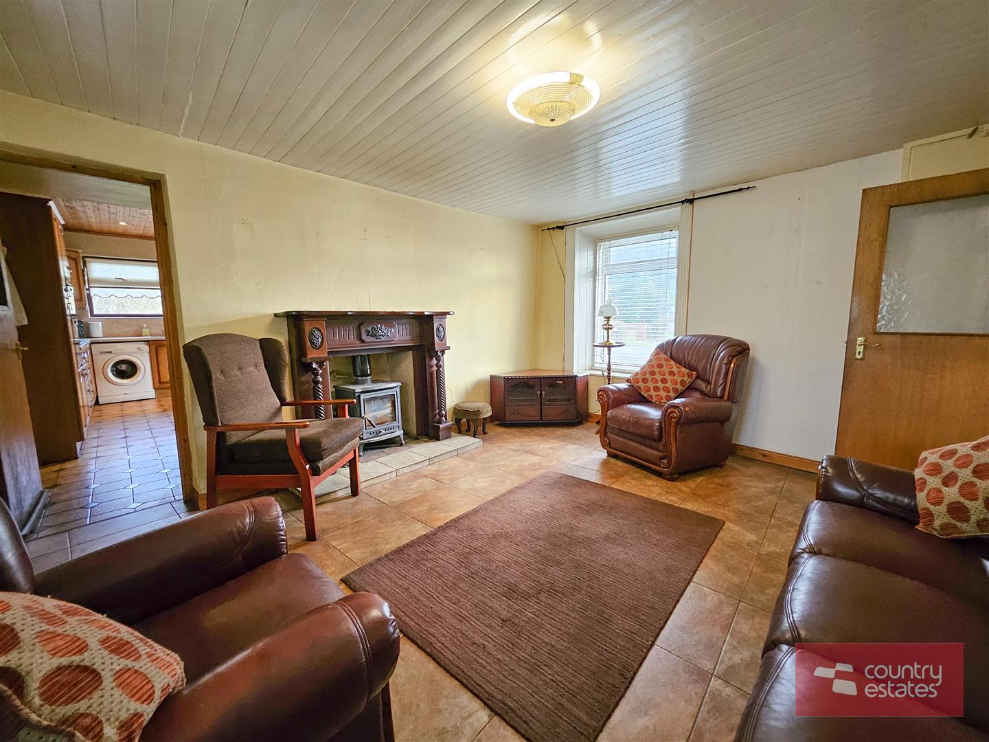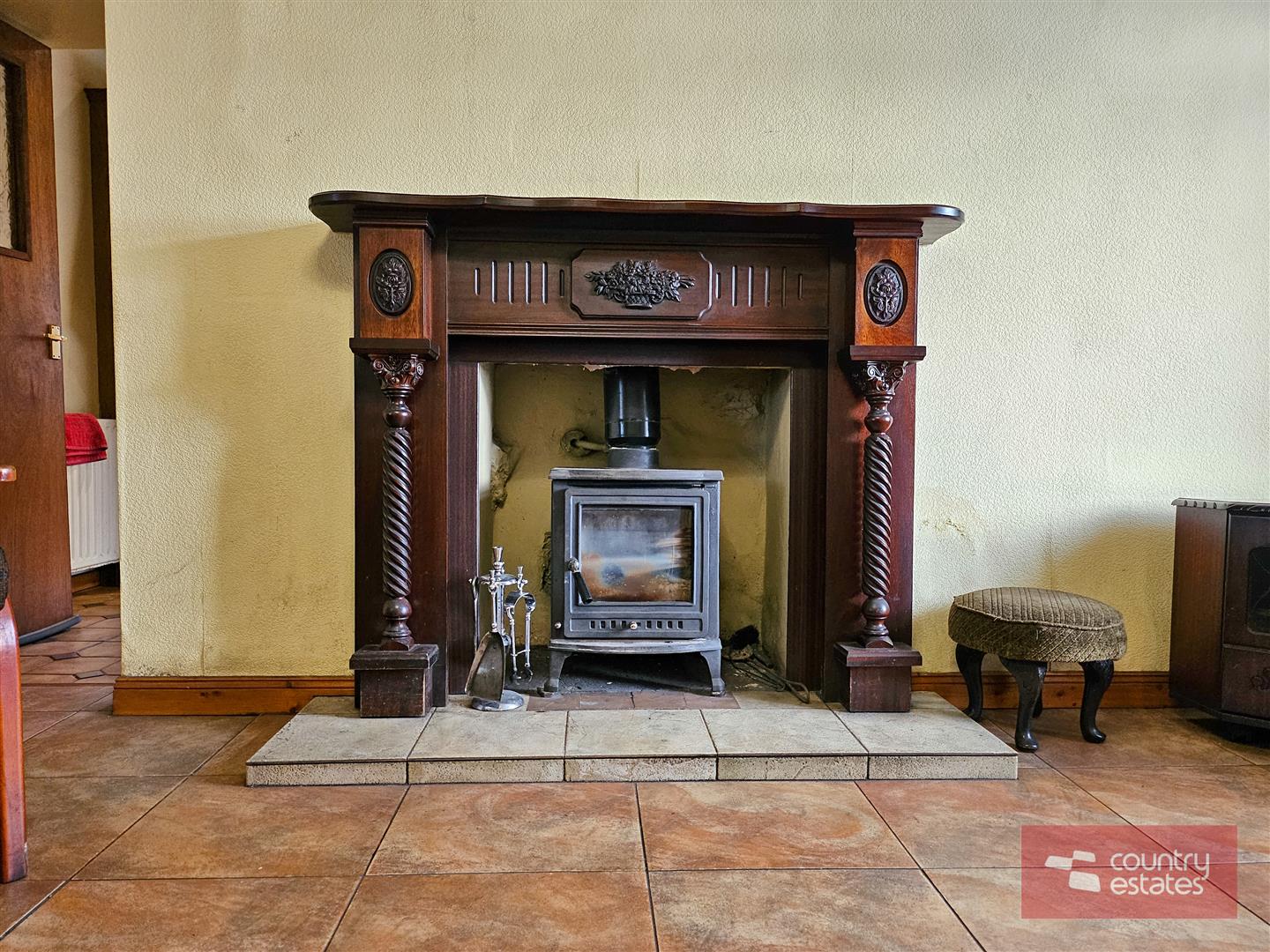 Feature fireplace with cast iron multi fuel stove. Tiled floor. Wood panelled ceiling. Access to understairs storage cupboard