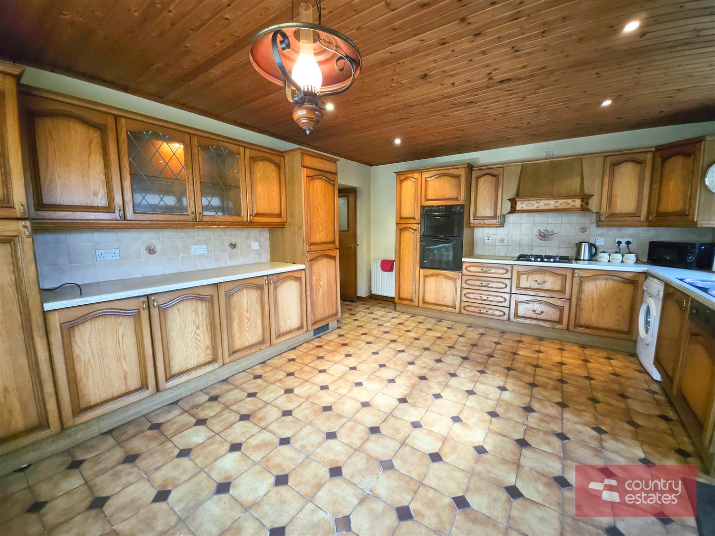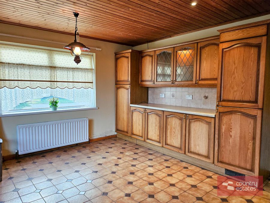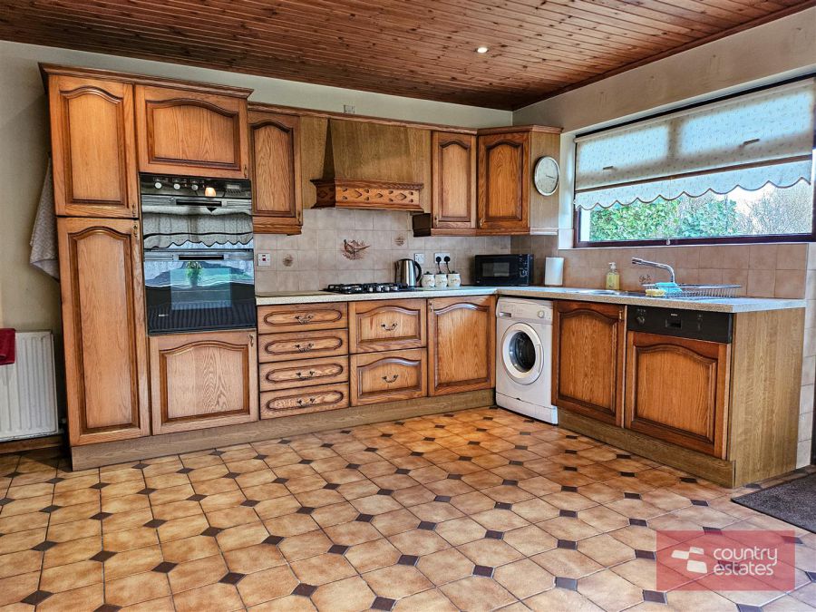 Equipped with a comprehensive range of high and low level fitted units with contrasting work surfaces. Twin leaded glass display cabinets. Single drainer stainless steel sink unit with mixer taps. Integrated eye level oven with separate four ring gas hob and overhead extractor fan housed in matching canopy. Integrated fridge/freezer and dishwasher. Plumbed for washing machine. Part tiled walls. Tiled floor. Wood panelled ceiling. PVC double glazed door to side gardens.