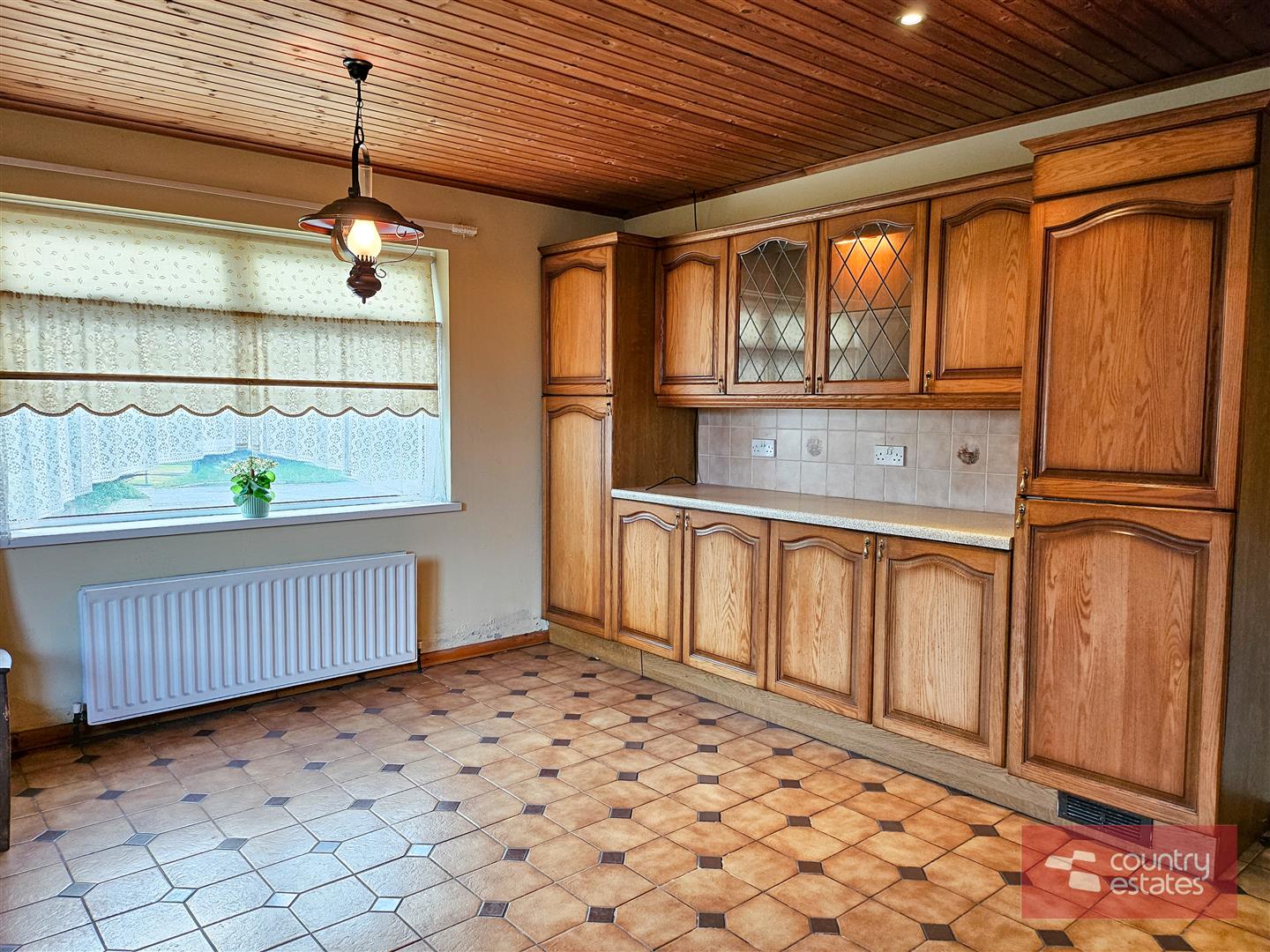 Wood panelled ceiling.