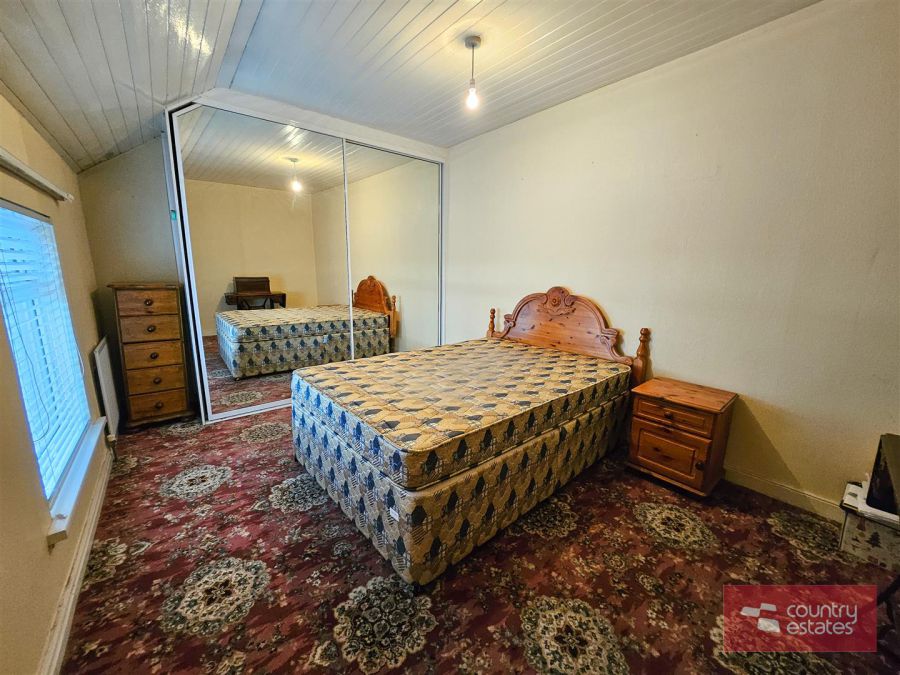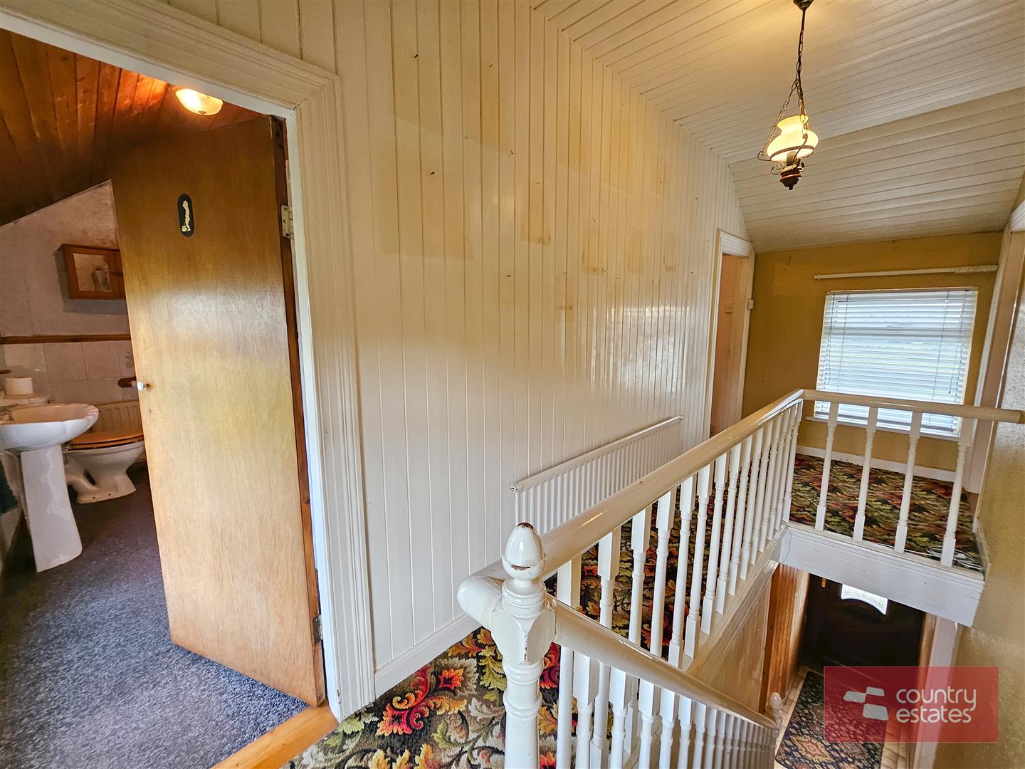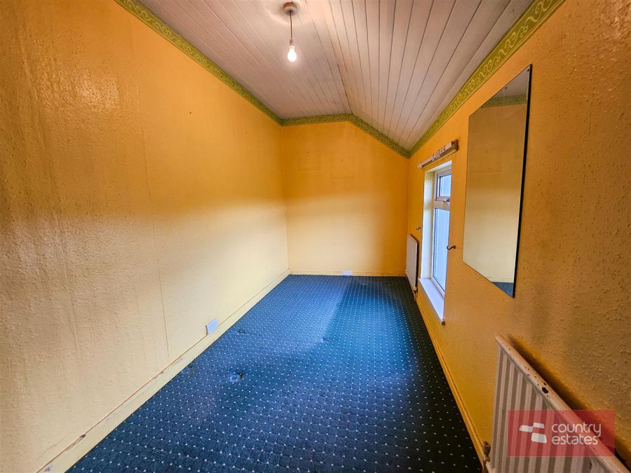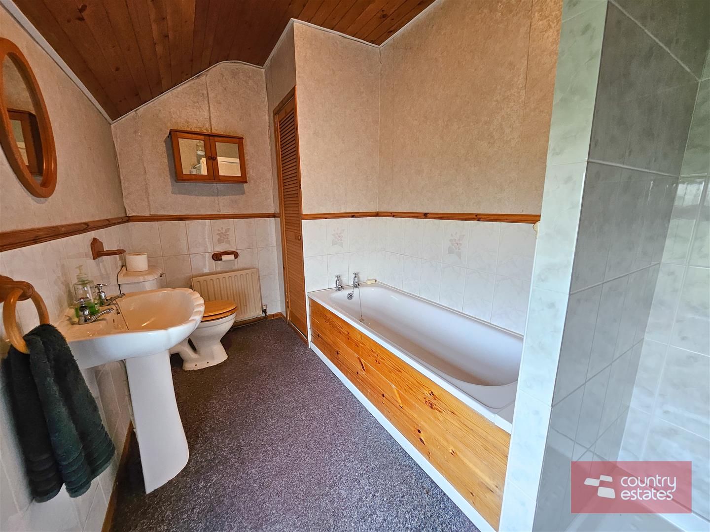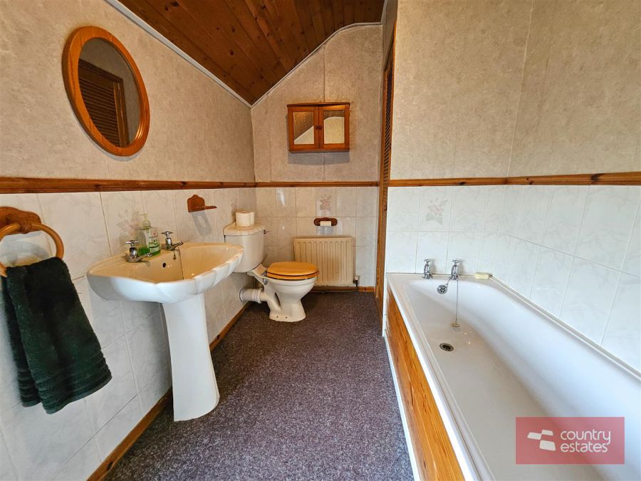 Comprising pedestal wash hand basin. Low flush WC. Wood panelled bath. Fully tiled Step in shower enclosure. Part tiled walls. Wood panelled ceiling. Shelved hot press.