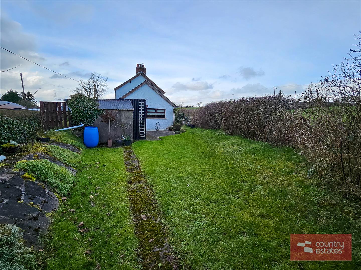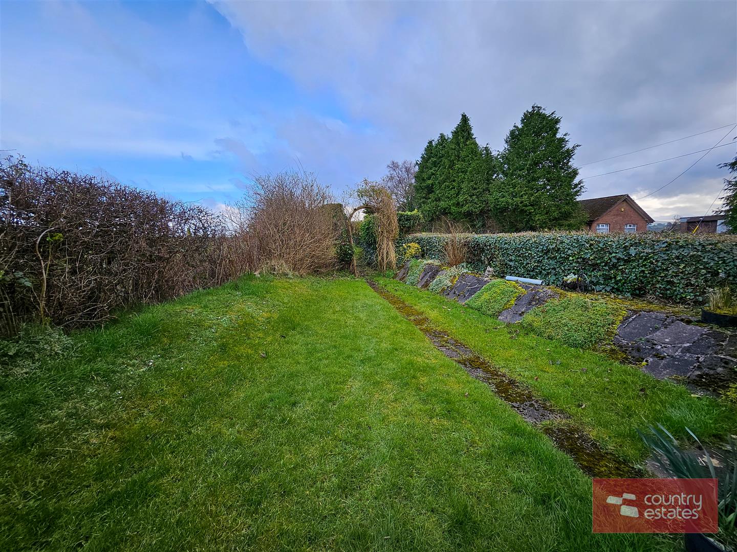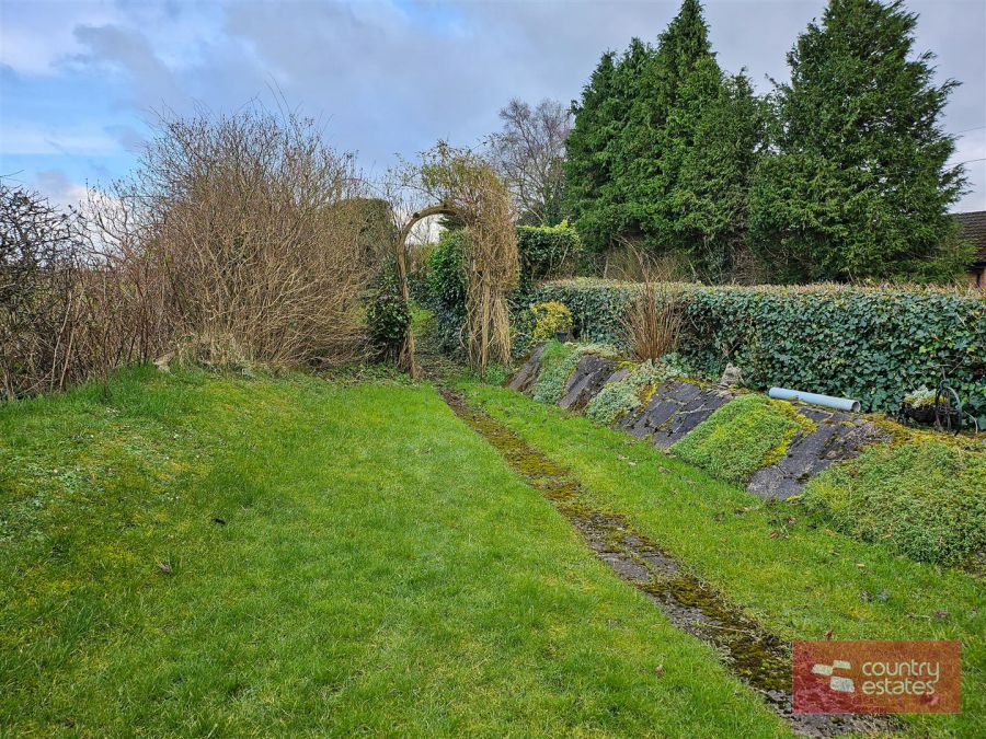 Extensive private mature garden to side laid in neat lawn, screened by perimeter shrubs and hedgerow.