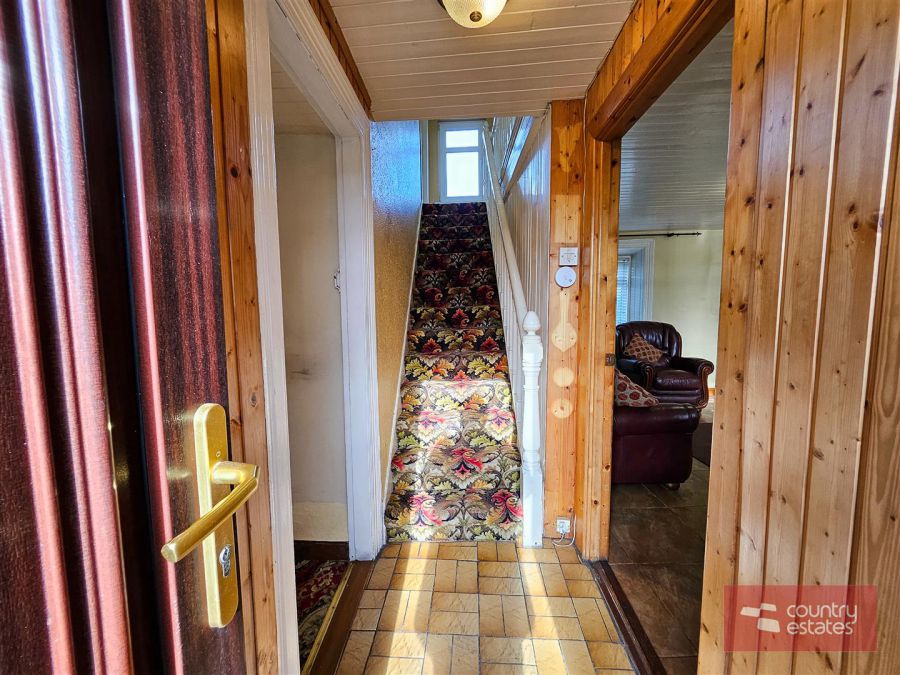 PVC double glazed front door with leaded glass inset into entrance hall with tiled floor and wood panelled walls and ceiling