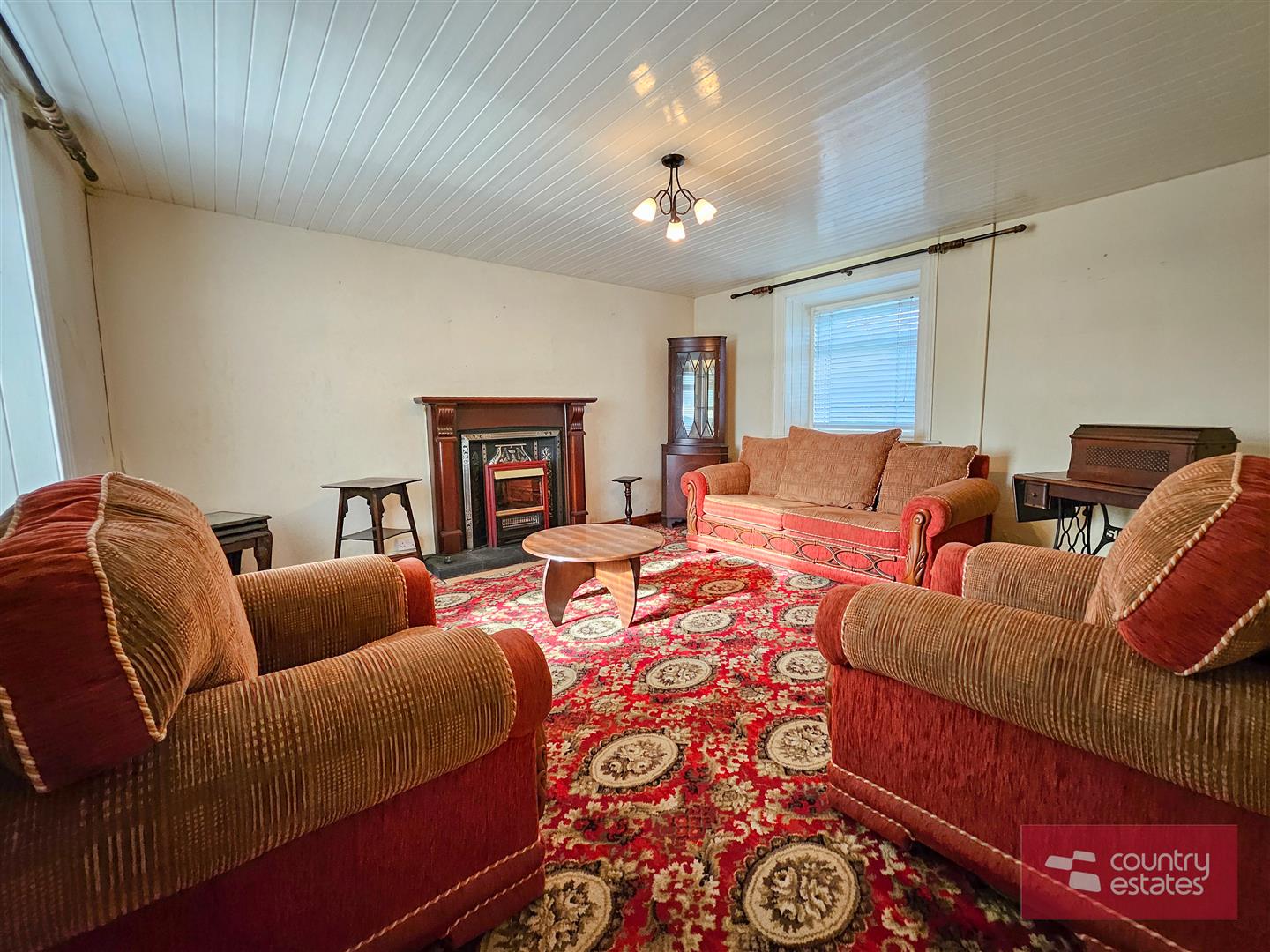 Feature fireplace with decorative cast iron surround and tiled hearth. Painted wooden panelled ceiling