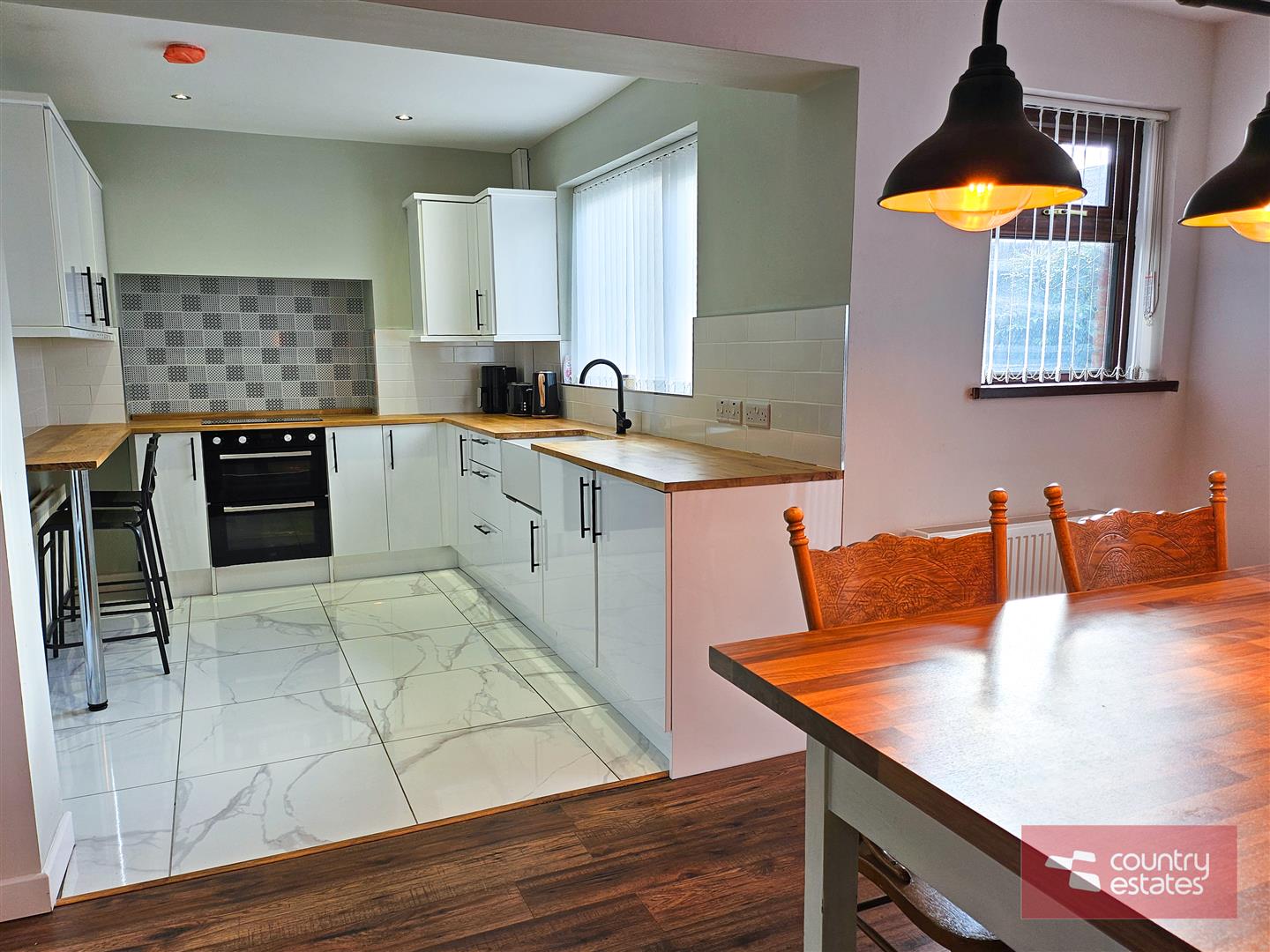 Equipped with a comprehensive range of high and low level fitted units in gloss white finish with contrasting work surfaces and breakfast bar style return. Belfast sink with black swan neck tap. Integrated cooker with separate four ring electric hob. Space for under counter fridge. Part tiled walls. Tiled floor in white marble effect.