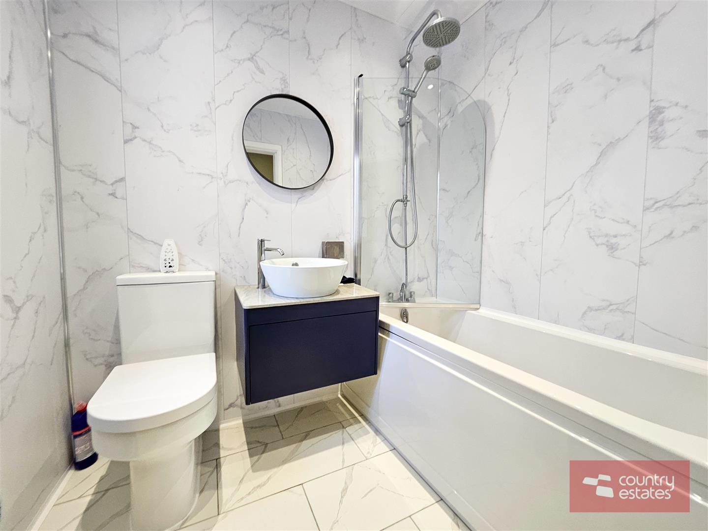 Comprising button flush WC. Wall mounted vanity unit with counter top wash hand basin and monobloc tap. Panelled bath fitted with glass shower screen and thermostatically controlled drench style shower with hand shower attachment. PVC Panelled walls and ceiling. White marble effect tiled floor. Recessed lighting.