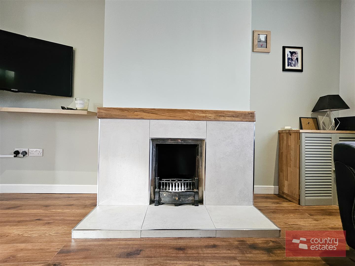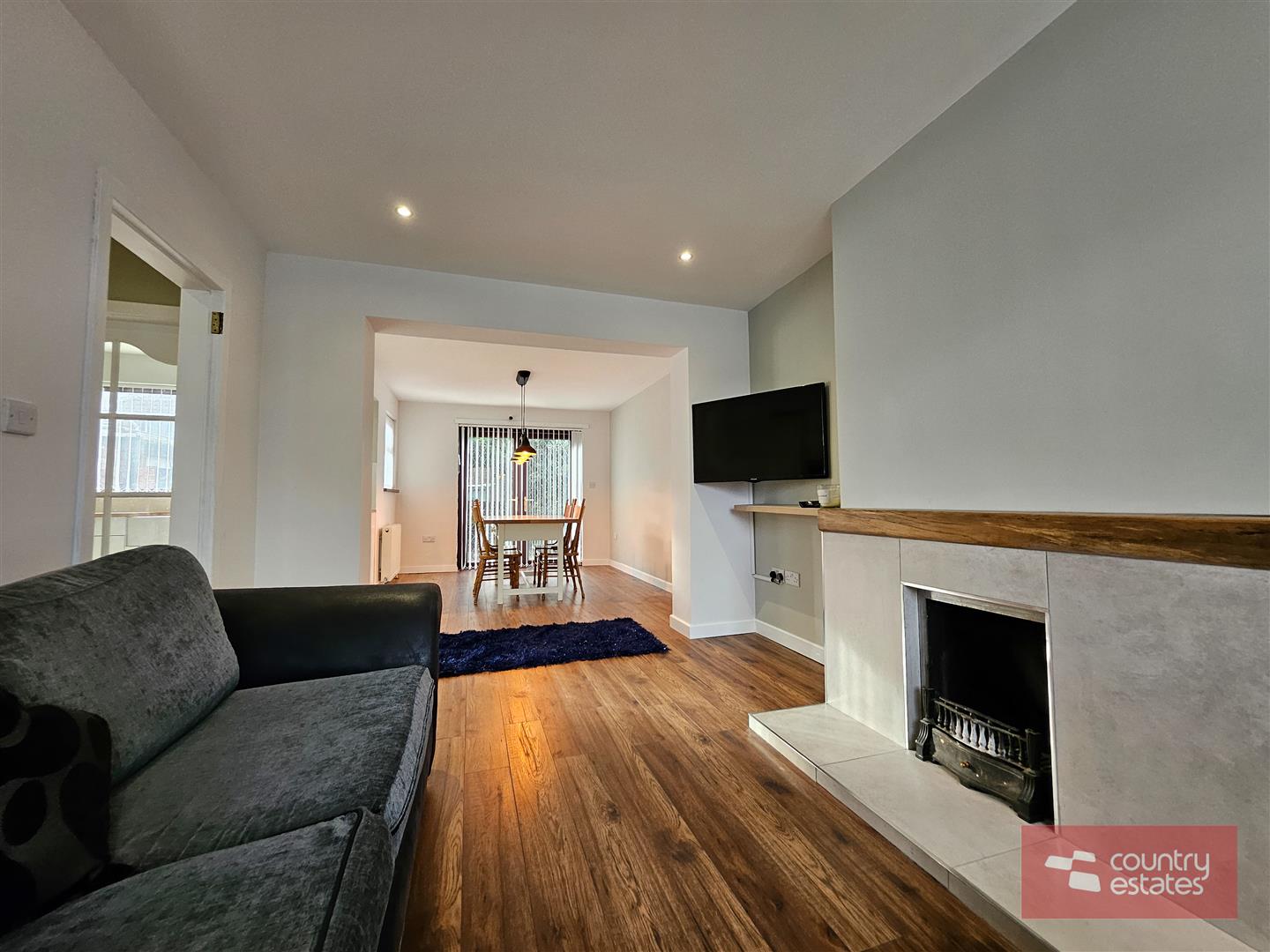 Feature tiled fire place with open fire. Recessed lighting. Quality laminate strip flooring. Open Plan into: