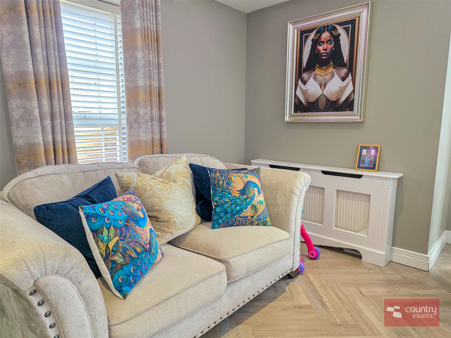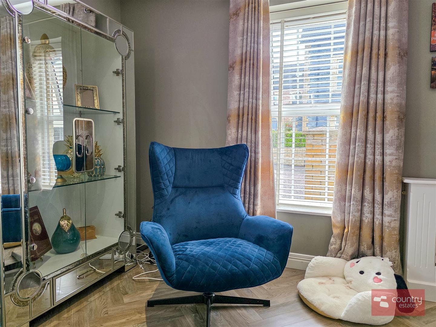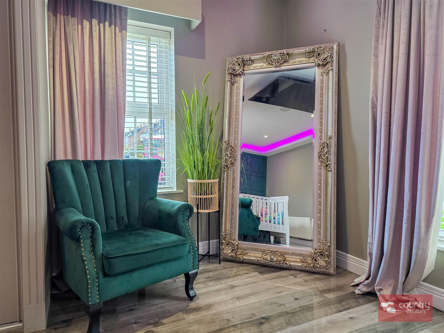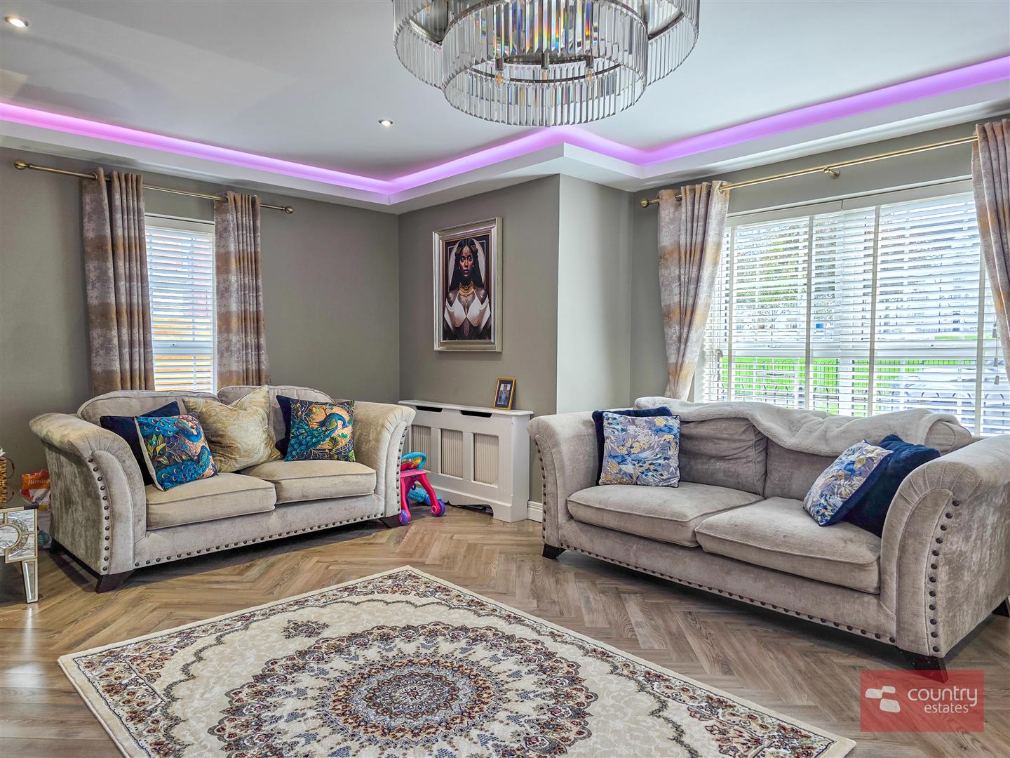 into Bay window. Feature media wall with inset glazed electric fire. Quartz window sills. Coffer ceiling effect with RGB mood lighting. Recessed down lighting. Fitted ceiling bluetooth speaker system.