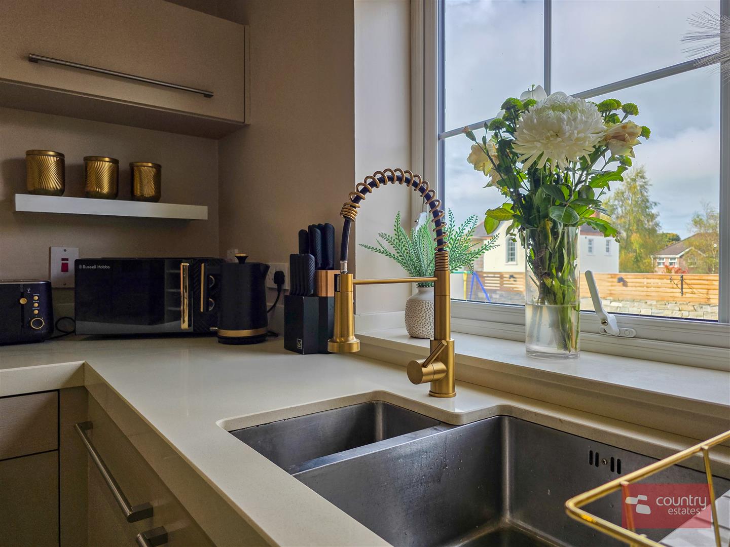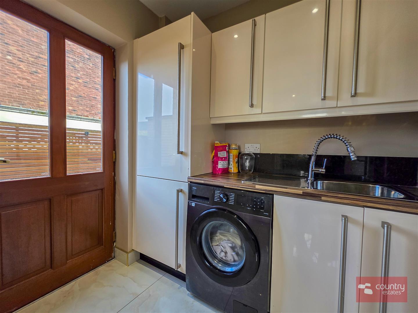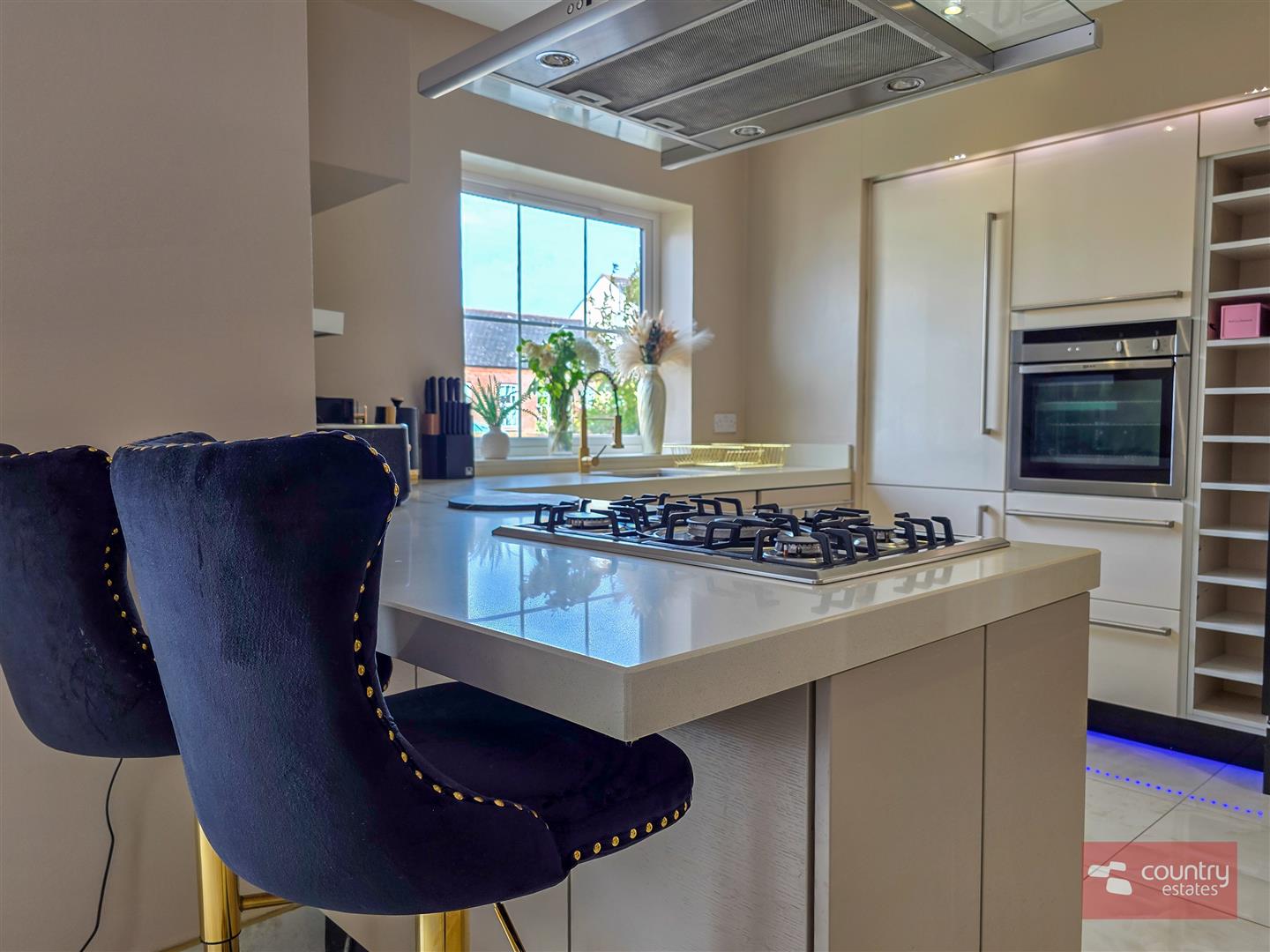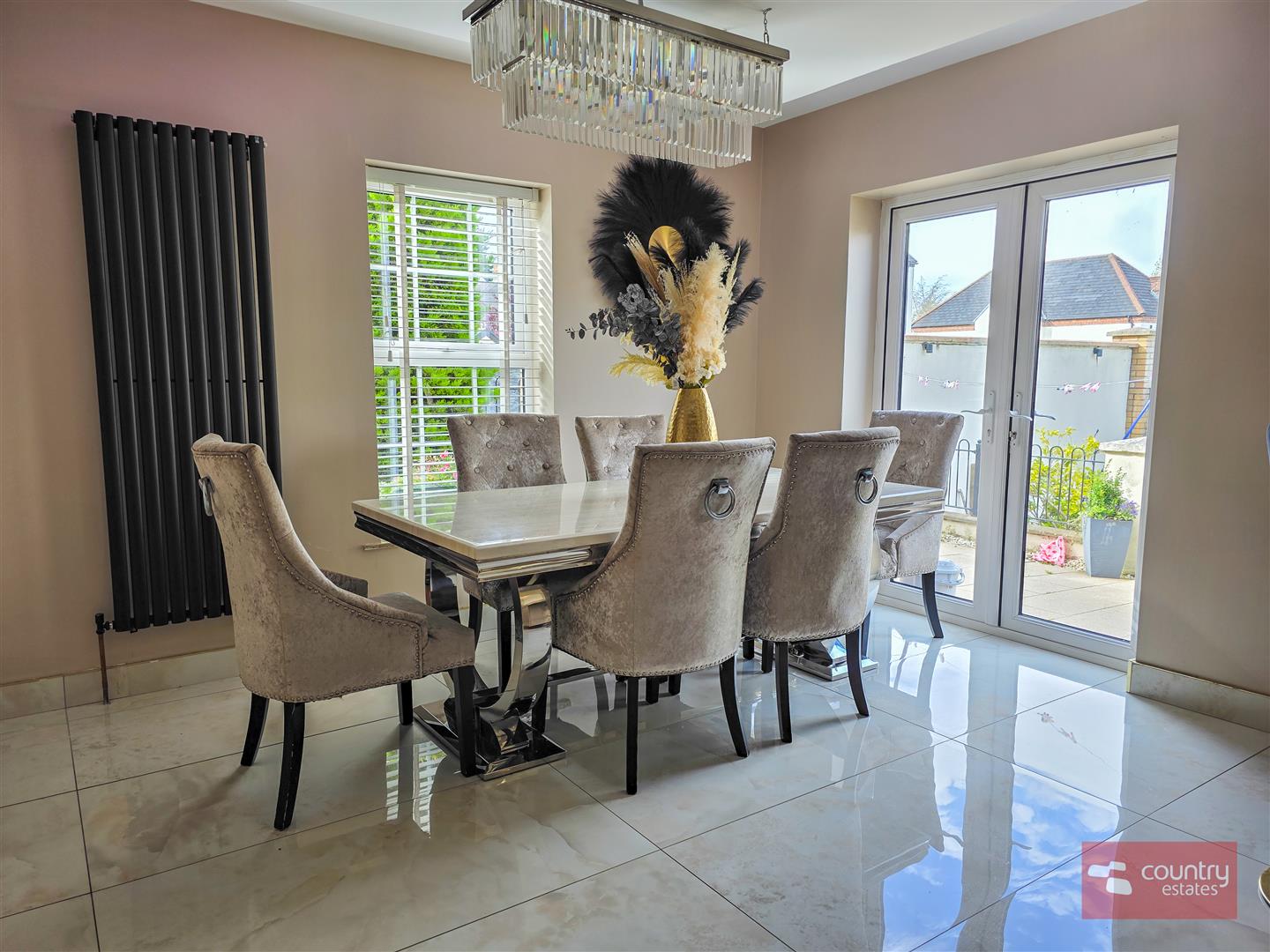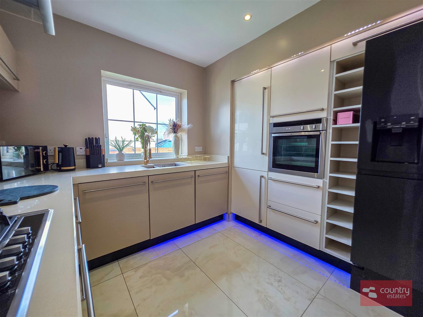 Equipped with a comprehensive range of high and low level fitted units in gloss finish and contrasting solid quartz work surfaces and up stands. Undermounted one and a half bowl stainless steel sink unit with pull out mixer tap. Boasting a range of Neff integrated appliances to include a five ring gas hob with overhead extractor fan housed in stainless steel chimney, eye-level oven and dishwasher. Space for free standing American style fridge freezer. Marble effect tiled flooring through dining and utility. PVC double glazed French doors to rear patio. Fitted ceiling bluetooth speaker system.