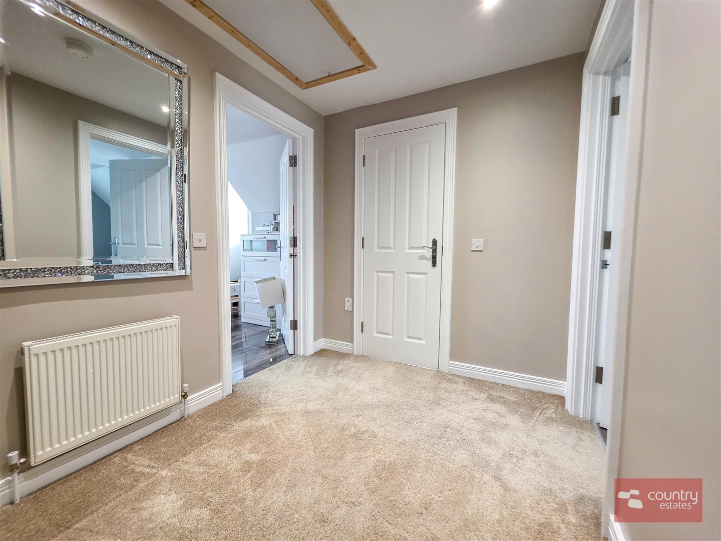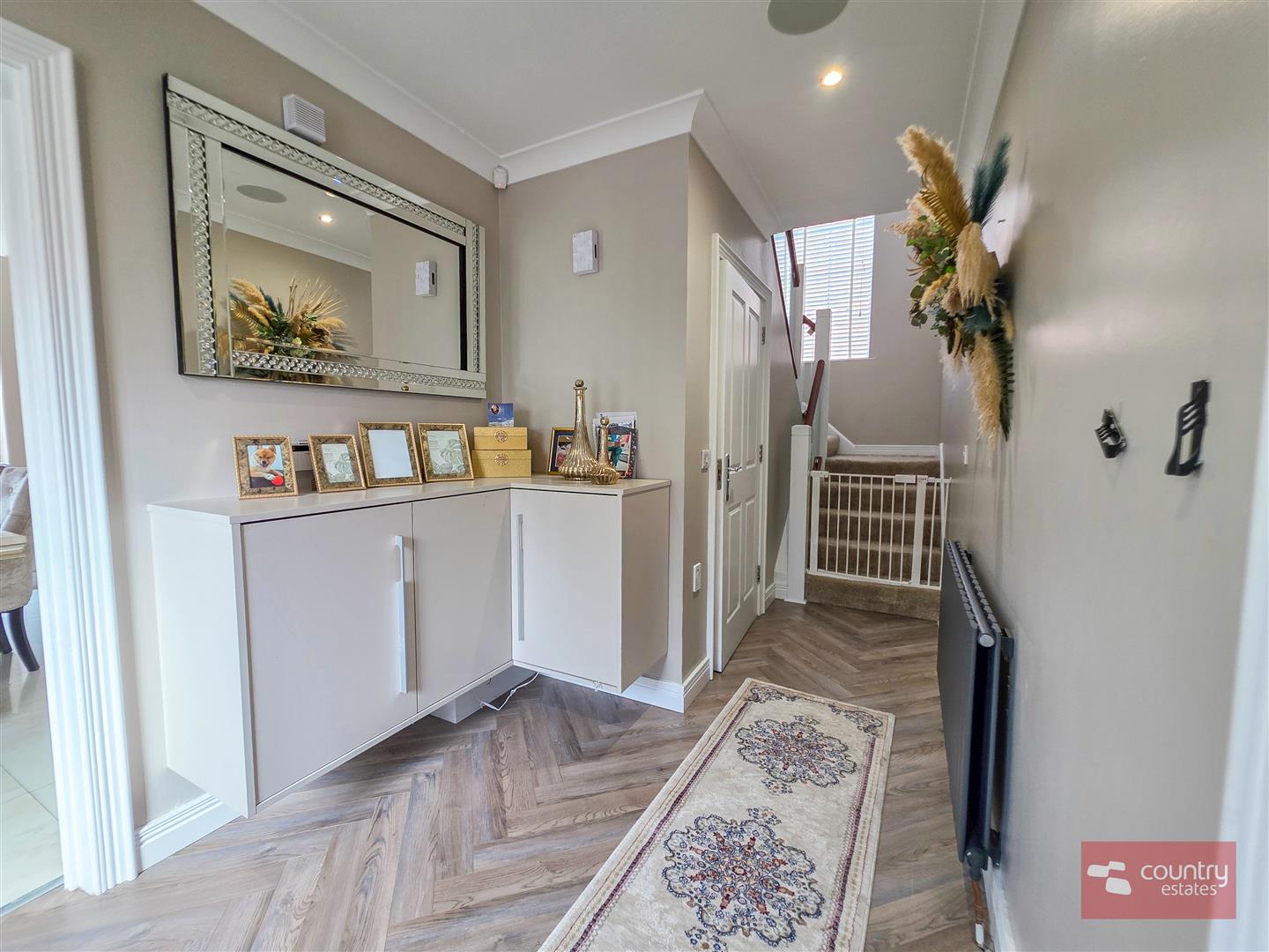 PVC double glazed front door with leaded insets into entrance hall. Quality Herringbone flooring. Recessed down lighting. Wall mounted high gloss storage units with under lighting. Beam vacuum point.