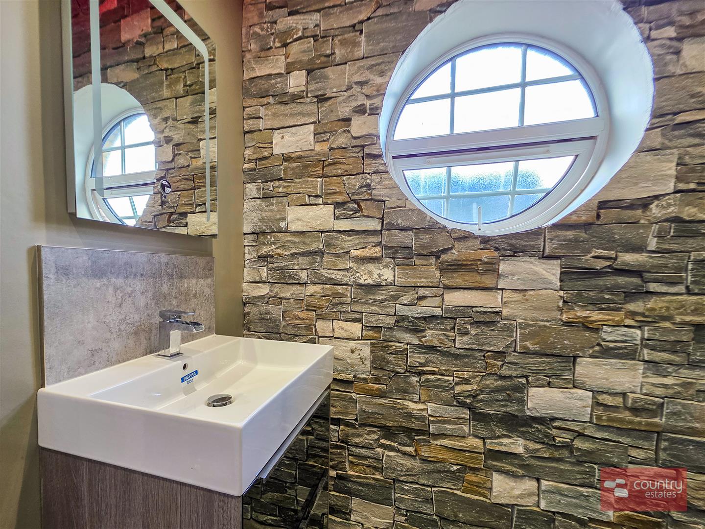Comprising fully tiled quadrant shower cubicle with drench style shower and hand shower attachment, semi pedestal vanity unit with monobloc tap and tiled splashback and button flush WC. Marble effect tiled floor. Chrome towel radiator. Coffer style ceiling with RGB LED lighting and built in ceiling fitted Bluetooth speaker system. Port hole style window. Stone cladded feature wall.
