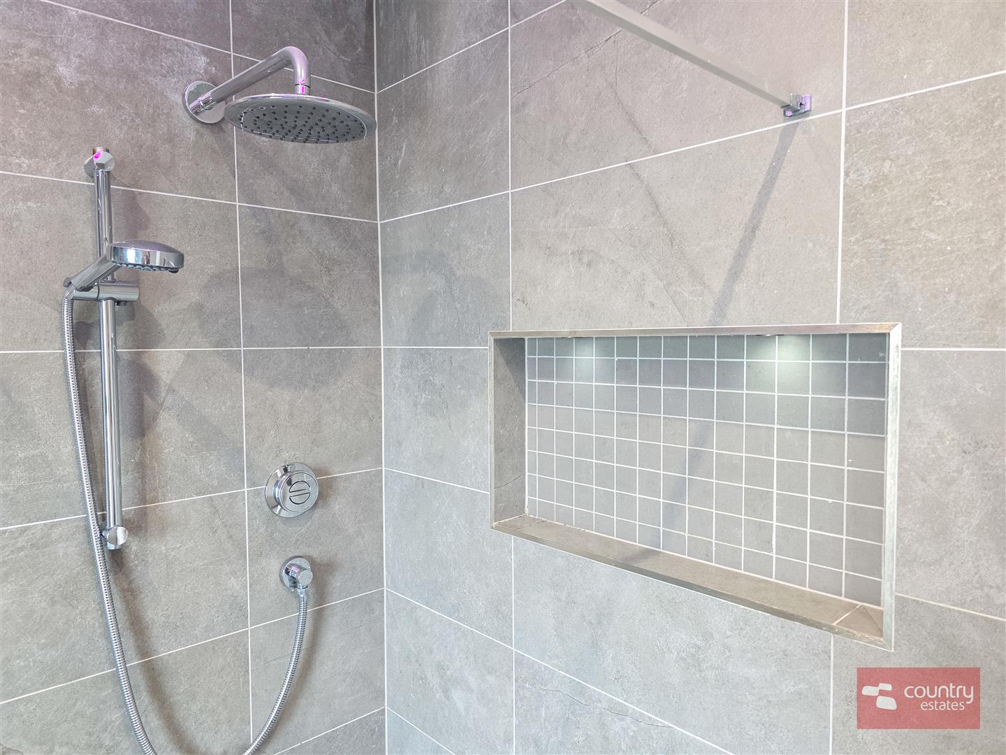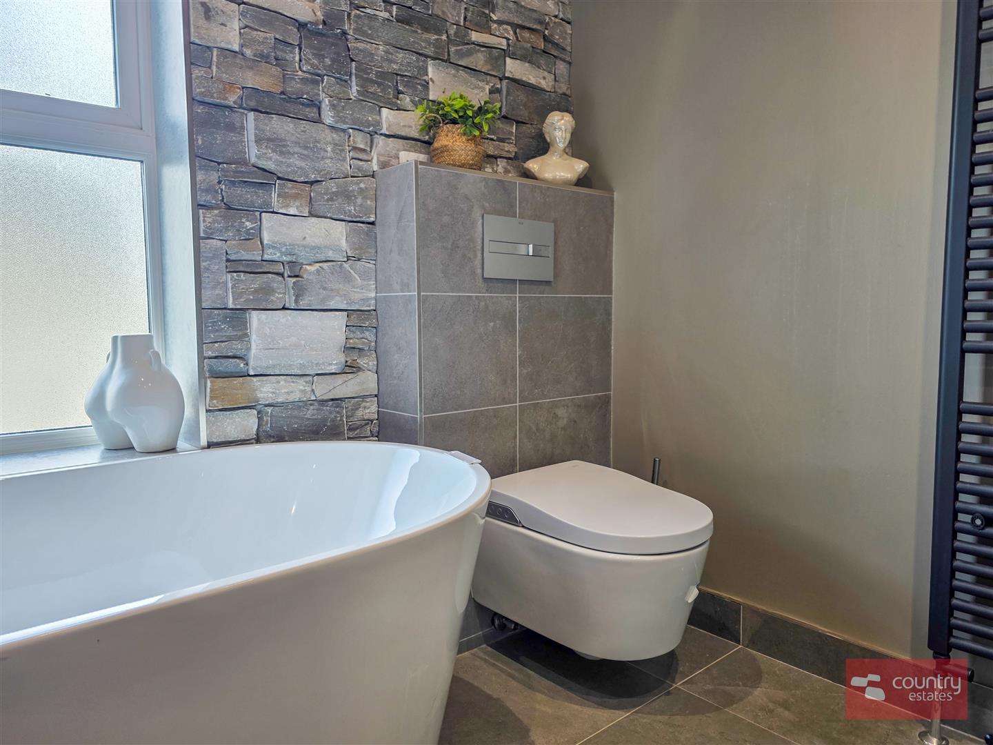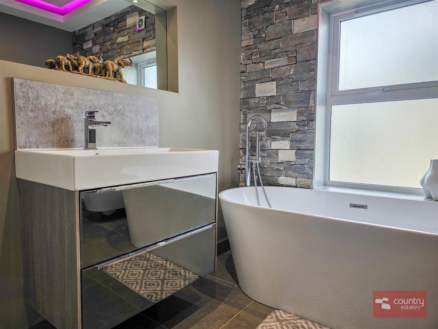 Comprising free standing double ended bath with floor mounted tap and hand shower attachment, fully tiled step in shower with drench style shower head, vanity unit wash hand basin with monobloc tap and a button flush WC. Coffer style ceiling with RGB LED lighting and built in ceiling Bluetooth speaker system. Stone cladded feature wall. Tiled floor.