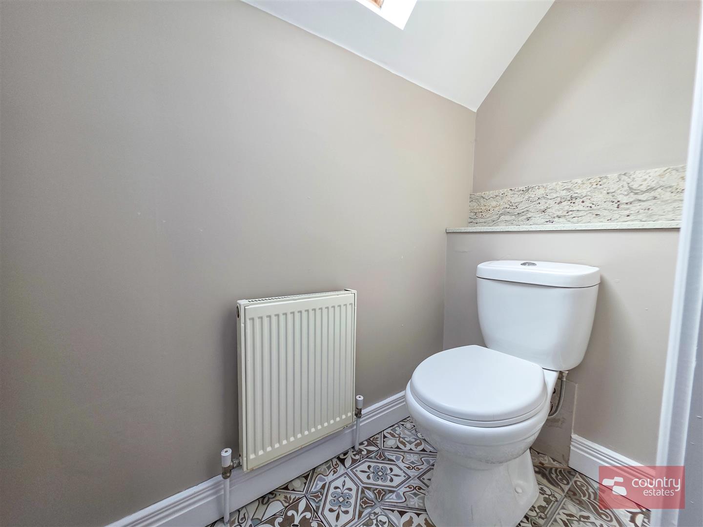 Comprising semi pedestal wash hand basin with monobloc tap and tiled splash back and a button flush WC. Velux window. Tiled floor.