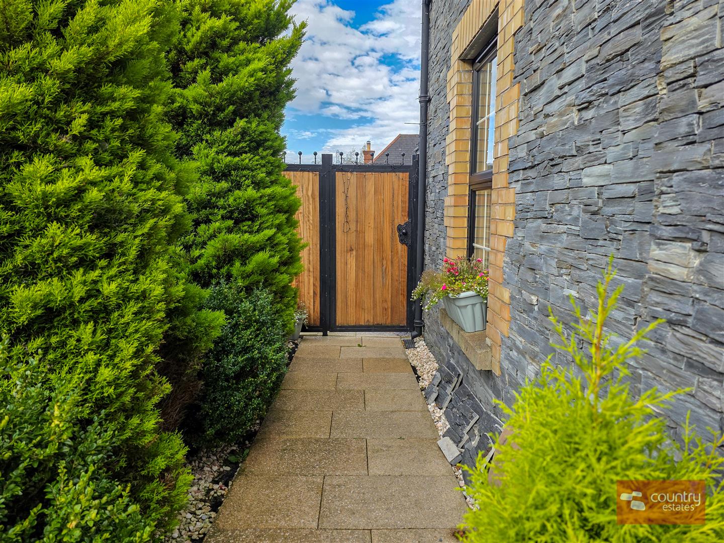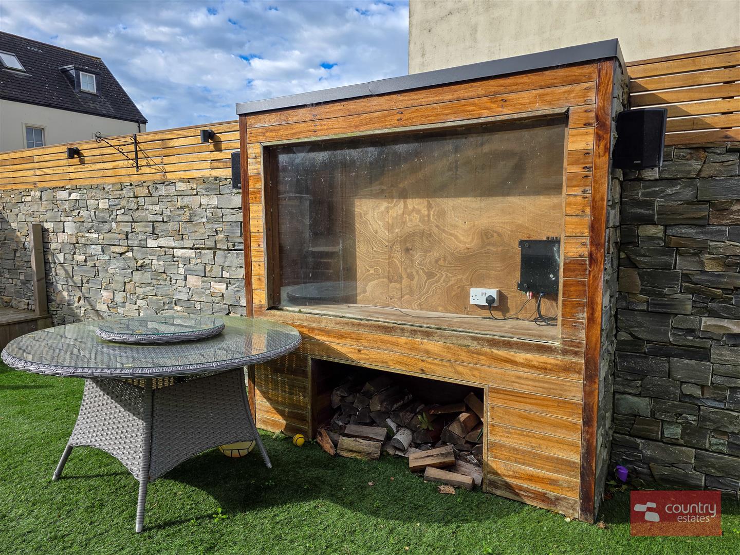 Private enclosed landscaped garden to rear with paved patio area. Low maintenance faux grass with decking area. Waterproof TV enclosure with power points. Screened by perimeter fence and stone wall. Outside power point. Outside tap.