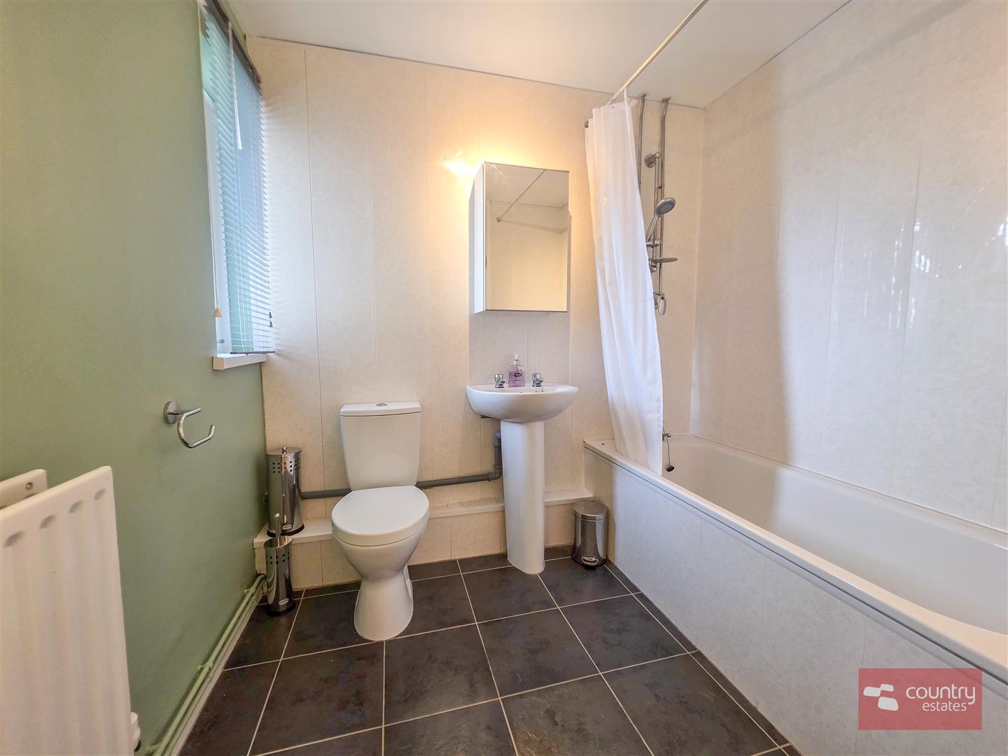 Comprising PVC panelled bath, thermostatically controlled shower over bath, pedestal wash hand basin and a button flush WC. Part PVC panelled walls. Tiled floor.