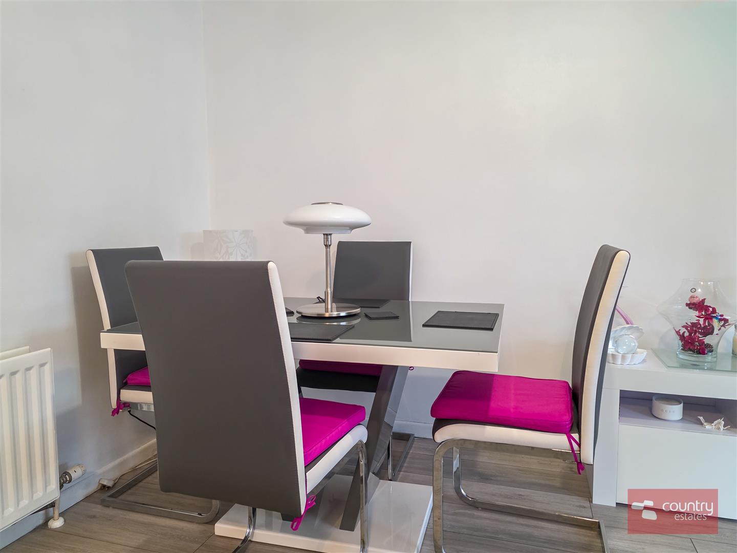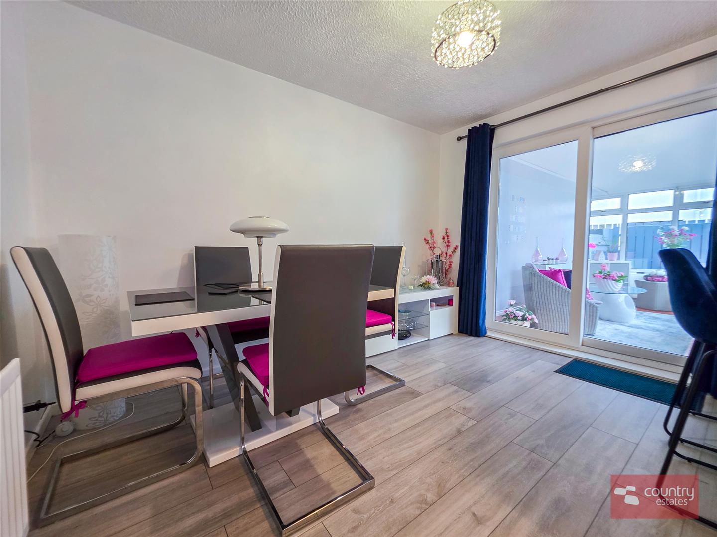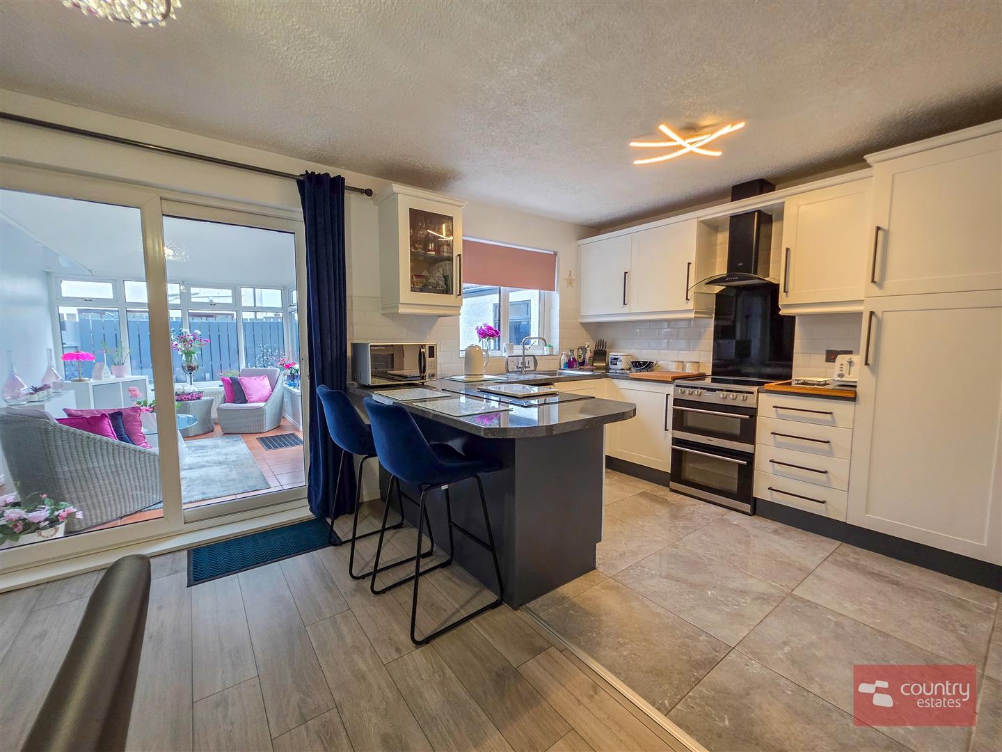 Equipped with a comprehensive range of high and low level shaker style fitted units and contrasting work surfaces and breakfast bar style return. Single drainer stainless steel sink unit with swan neck mixer tap. Space for free standing oven with overhead extractor fan housed in stainless steel canopy with glass hood. Plumbed for washing machine. Space for free standing fridge freezer. Tiled floor. Part tiled walls in metro brick style. Quality laminate flooring to dining aspect. PVC double glazed sliding door to:
