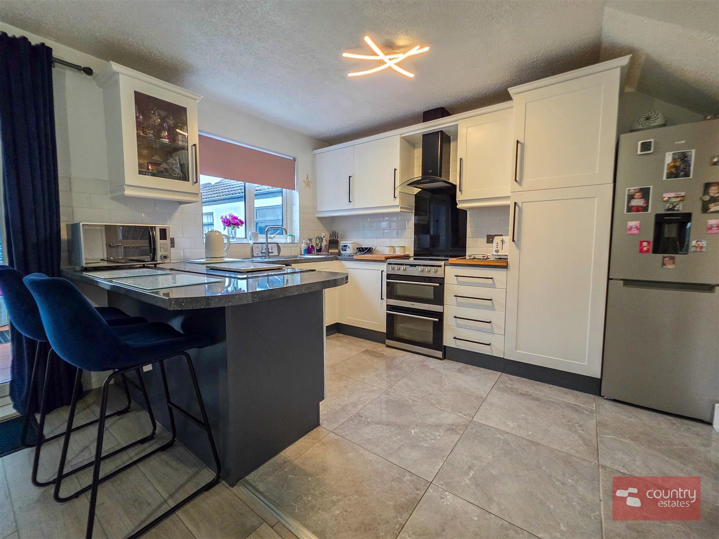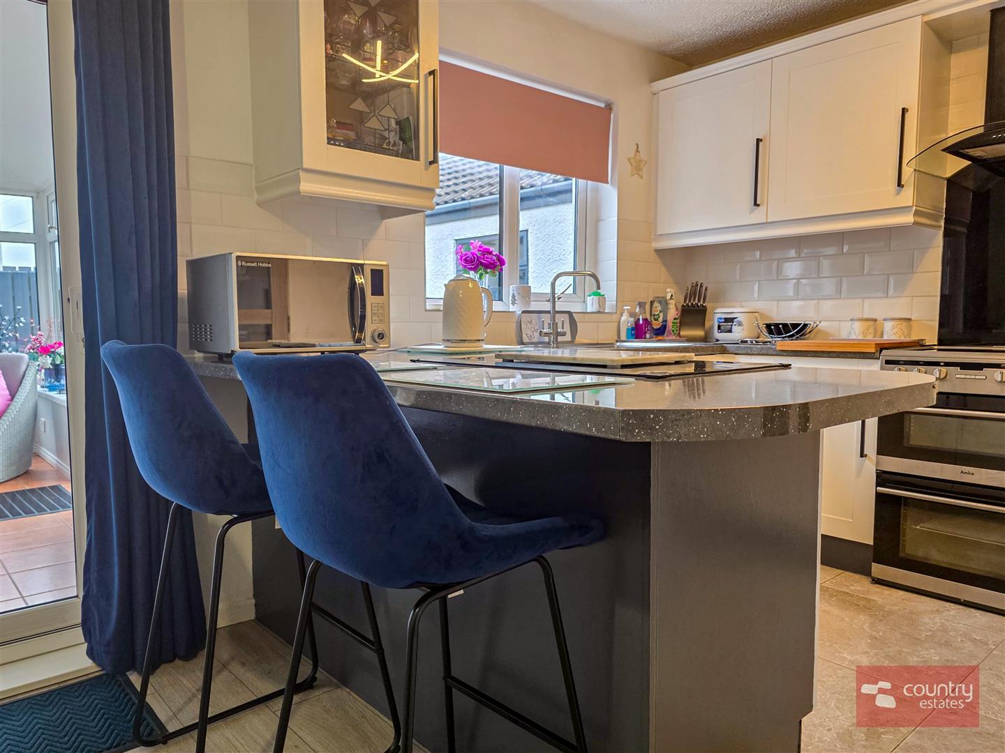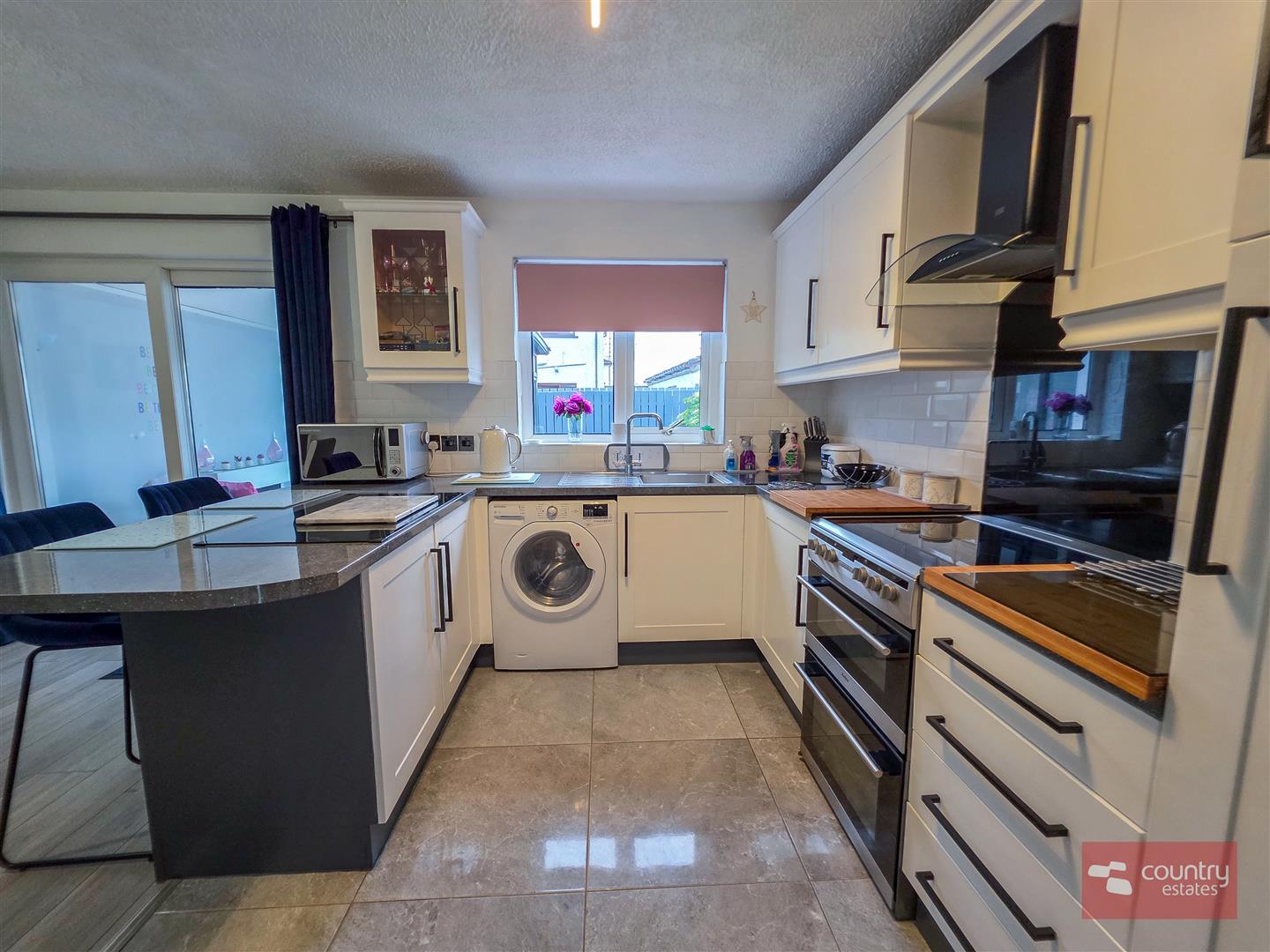 Equipped with a comprehensive range of high and low level shaker style fitted units and contrasting work surfaces and breakfast bar style return. Single drainer stainless steel sink unit with swan neck mixer tap. Space for free standing oven with overhead extractor fan housed in stainless steel canopy with glass hood. Plumbed for washing machine. Space for free standing fridge freezer. Tiled floor. Part tiled walls in metro brick style. Quality laminate flooring to dining aspect. PVC double glazed sliding door to: