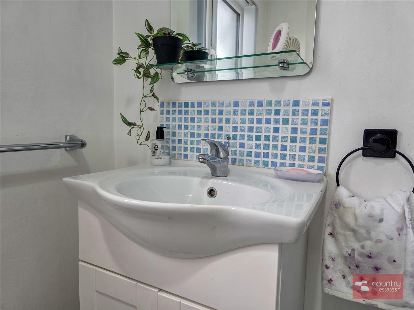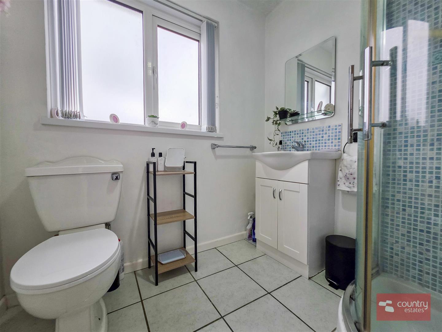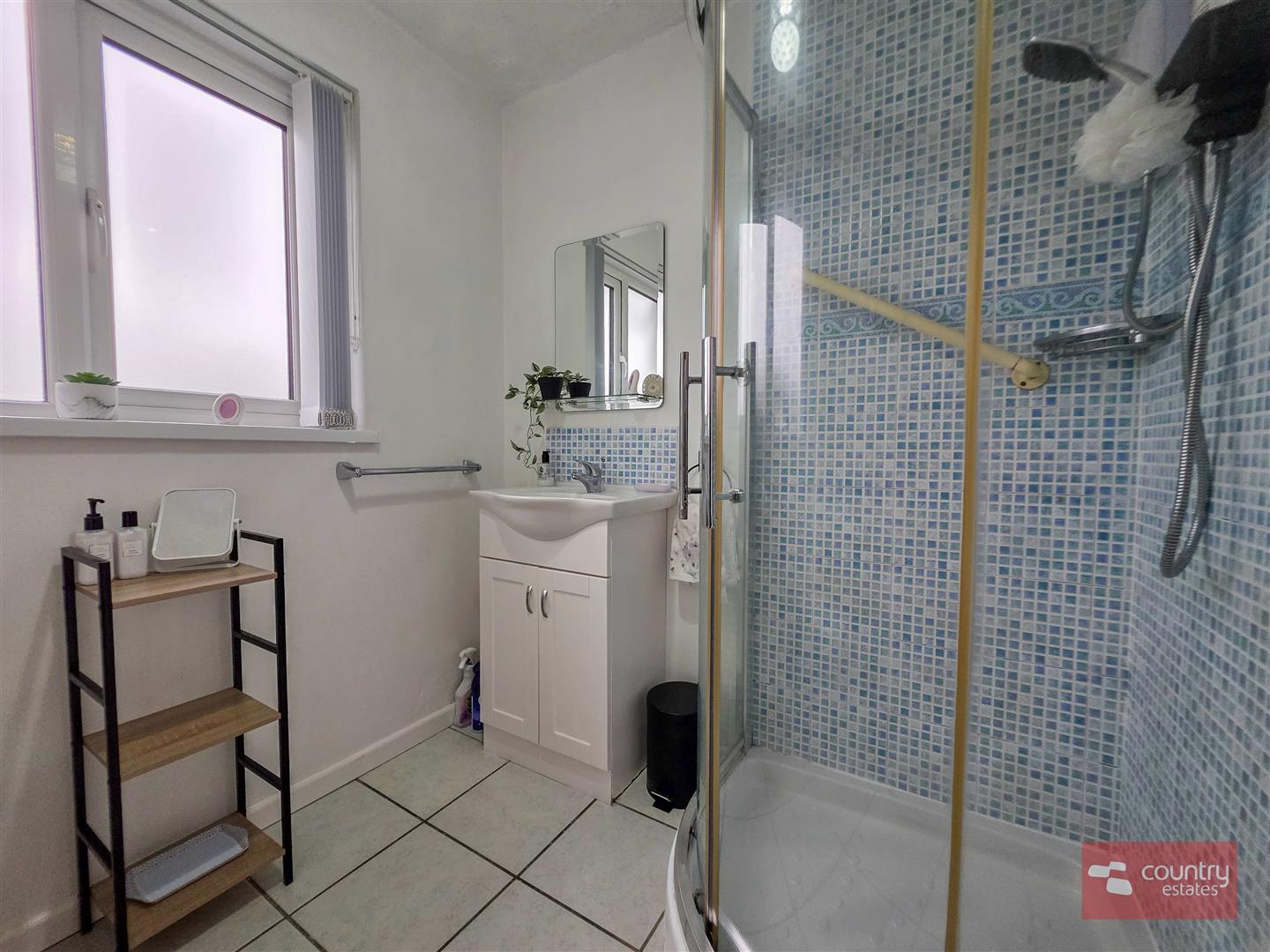 Comprising fully tiled quadrant shower cubicle with electric shower unit, vanity wash hand basin with monobloc tap and tiled splash back and a button flush WC. Tiled floor.