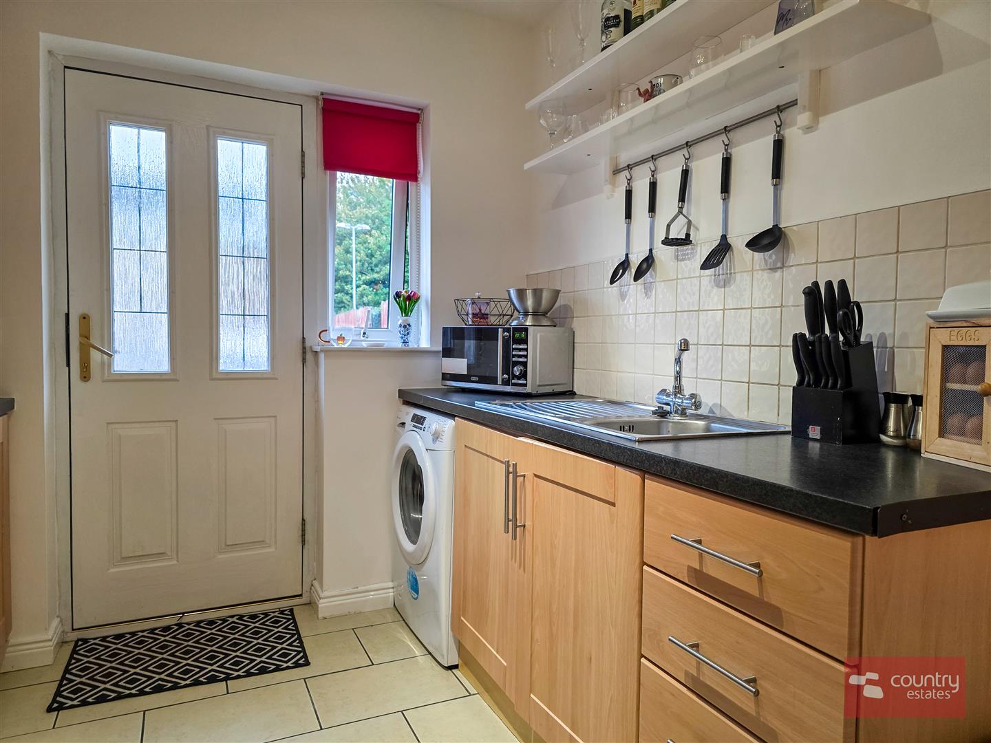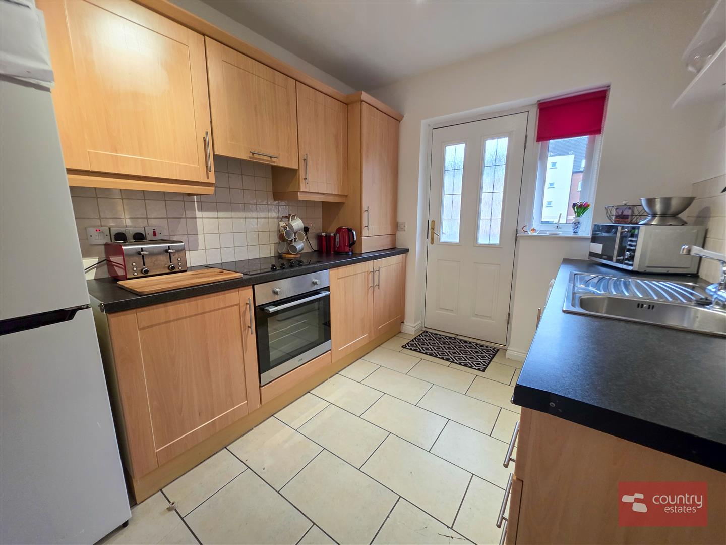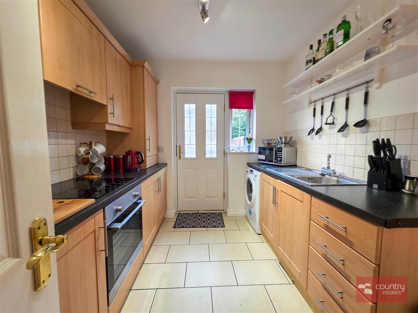 Equipped with comprehensive a range of high and low level shaker style effect fitted units and contrasting work surfaces. Single drainer stainless steel sink unit with mixer tap. Stainless steel integrated oven, separate four ring electric hob and an overhead extractor fan housed in matching pull out canopy. Plumbed for washing machine. Complimentary part tiled walls. Tiled floor. Access to driveway at rear.