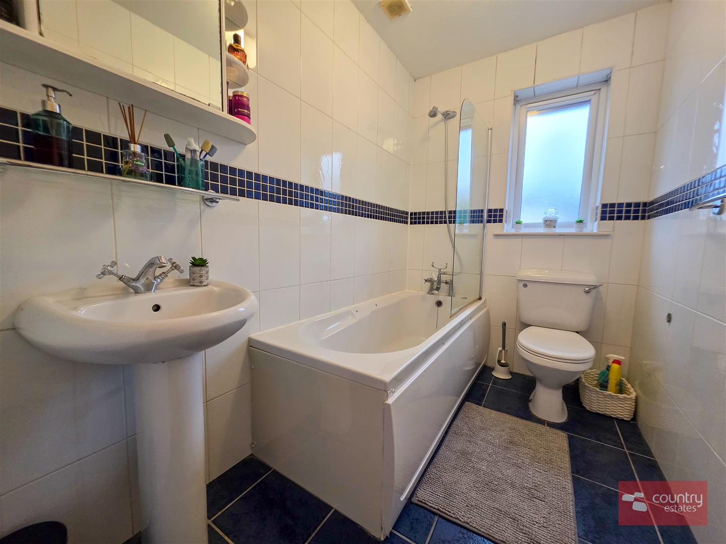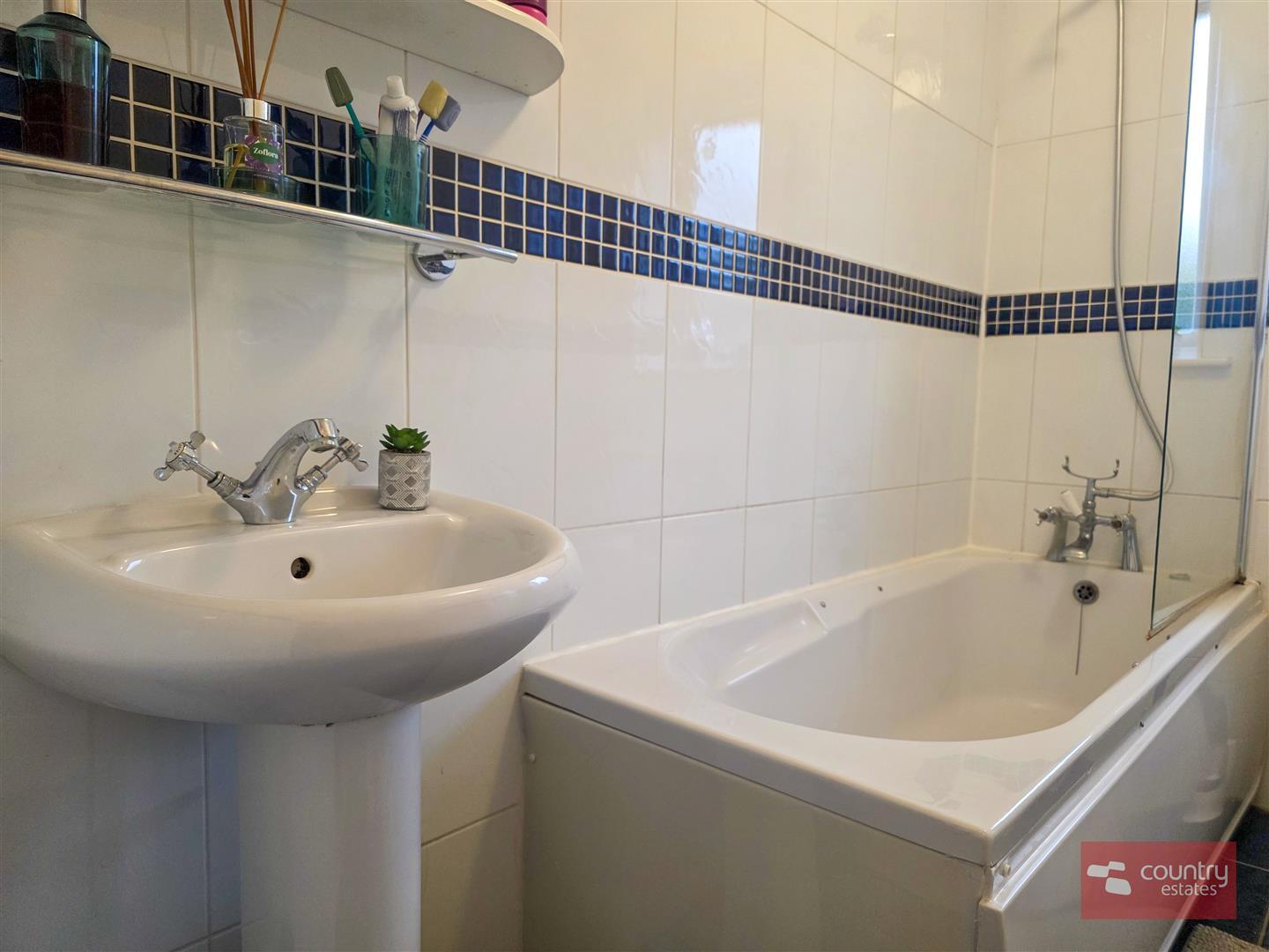 Comprising panelled bath with shower attachment and glazed shower screen. Pedestal wash hand basin. Low flush WC. Tiled floor. Fully tiled walls.
