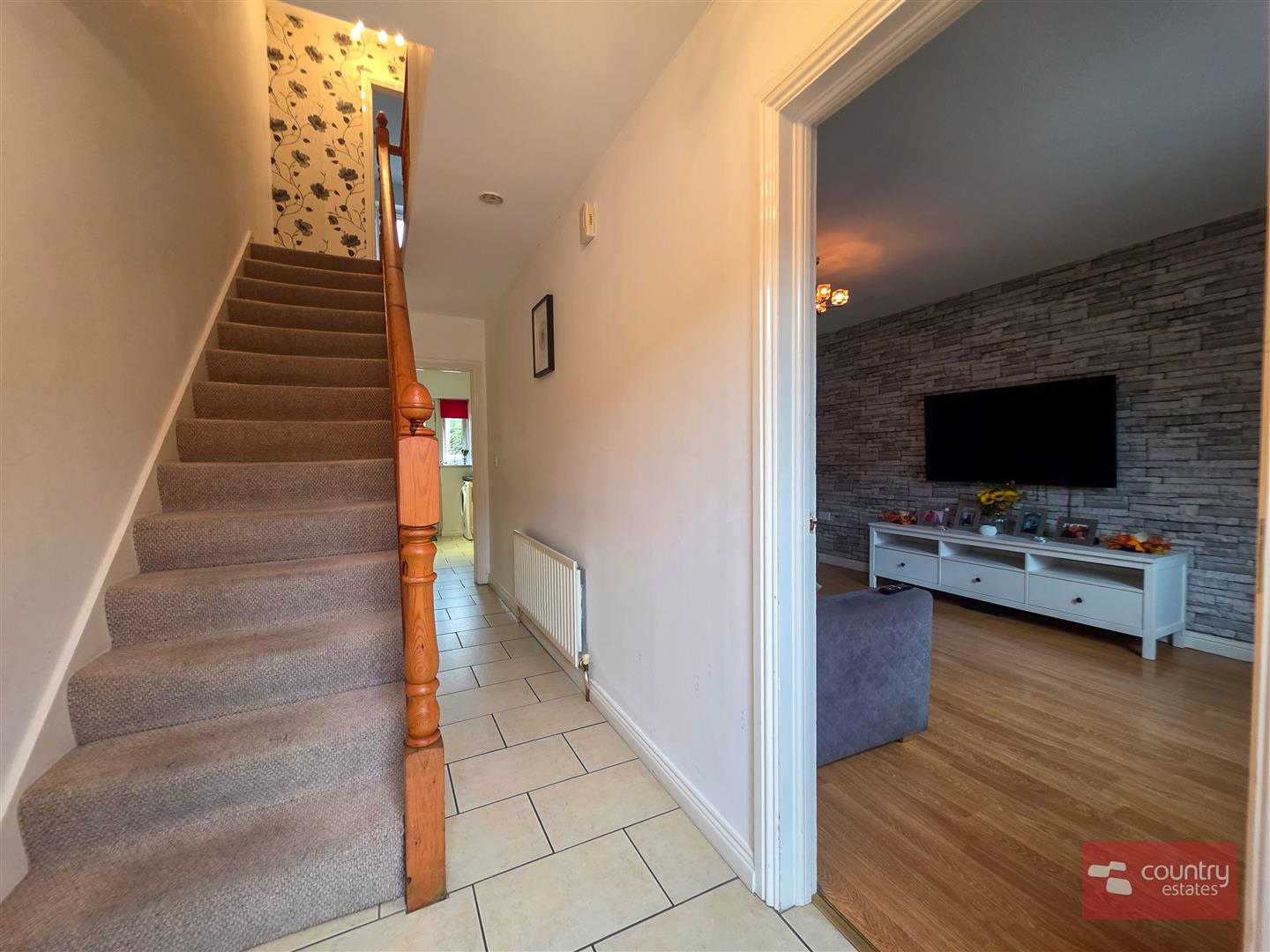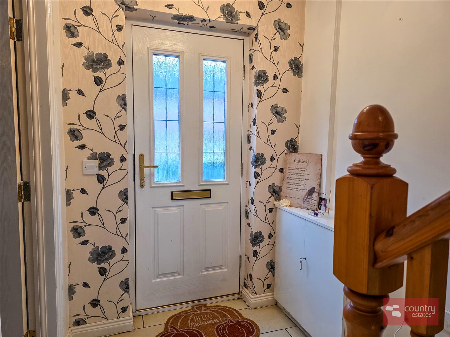 Double glazed hard wood door into spacious well presented entrance hall with tiled floor. Understairs storage cupboard.