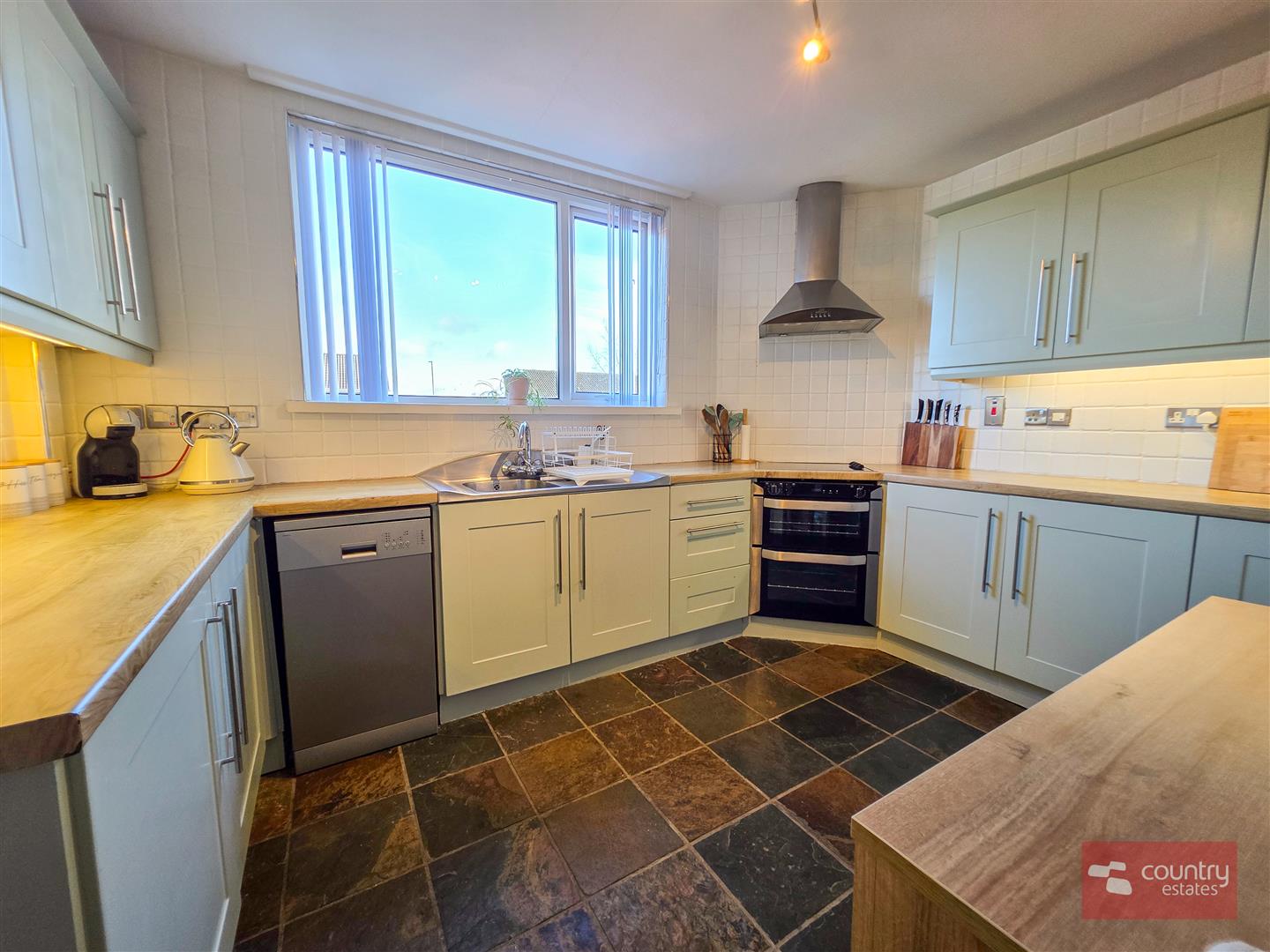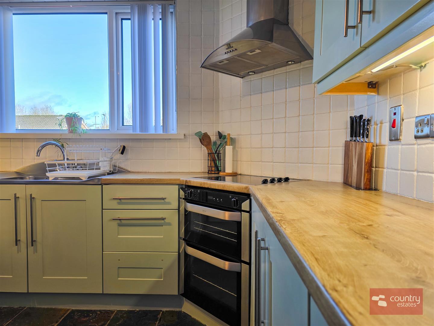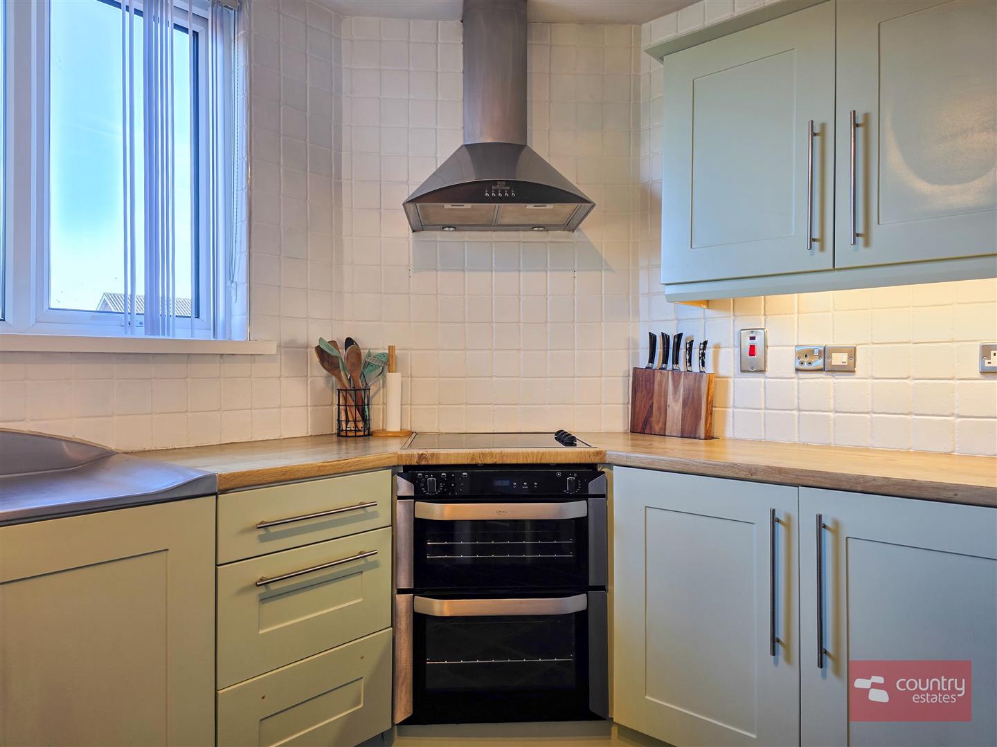 Equipped with a comprehensive range of high and low level shaker style fitted units with contrasting work surfaces. Single drainer stainless steel sink unit with swan neck mixer tap. Integrated oven with separate four ring electric hob and overhead extractor fan housed in stainless steel canopy. Integrated under counter fridge and freezer. Plumbed for dishwasher. Part tiled walls. Tiled floor.