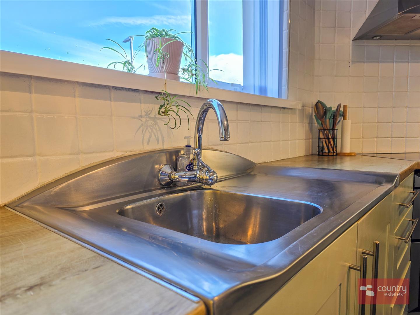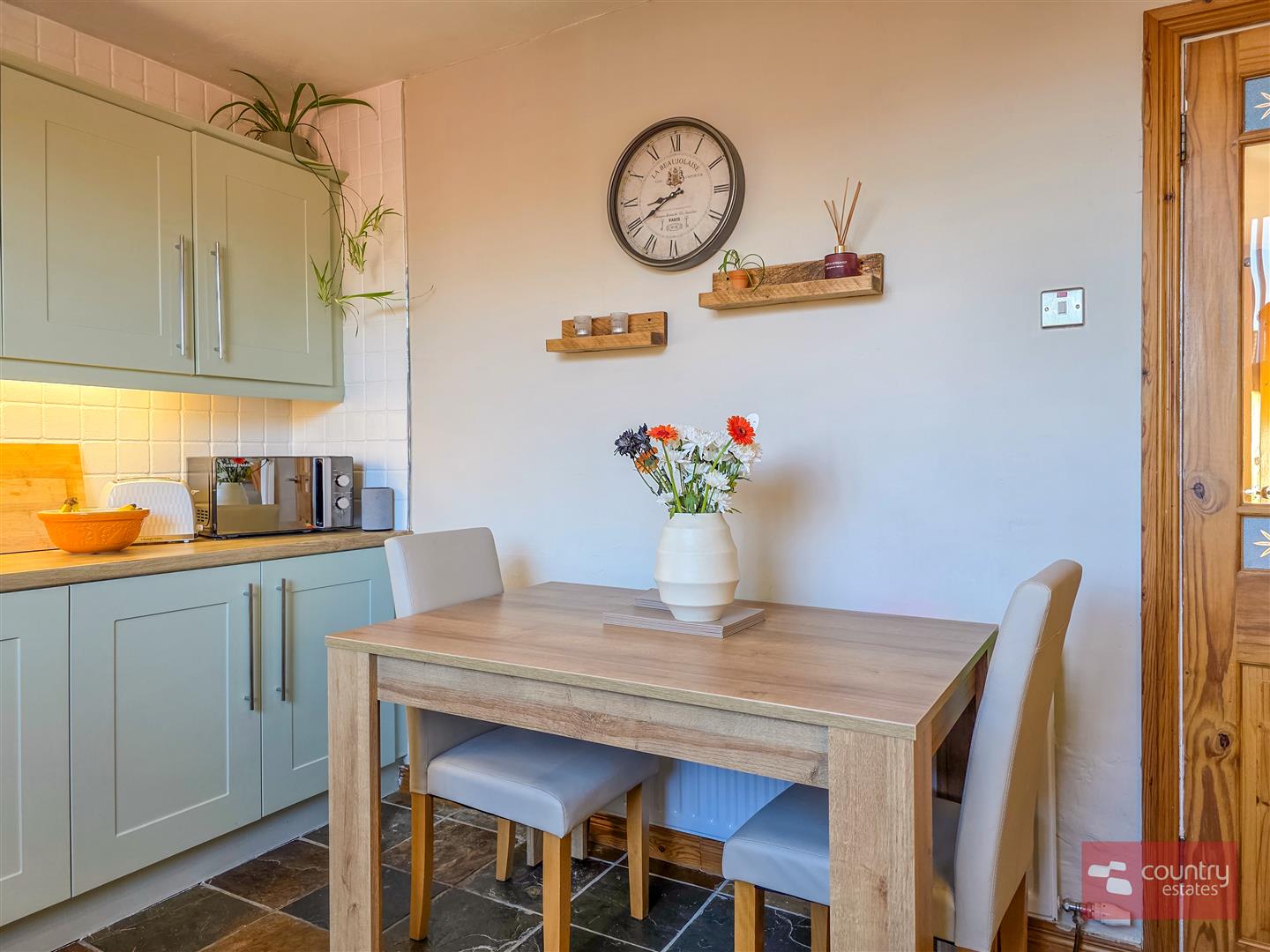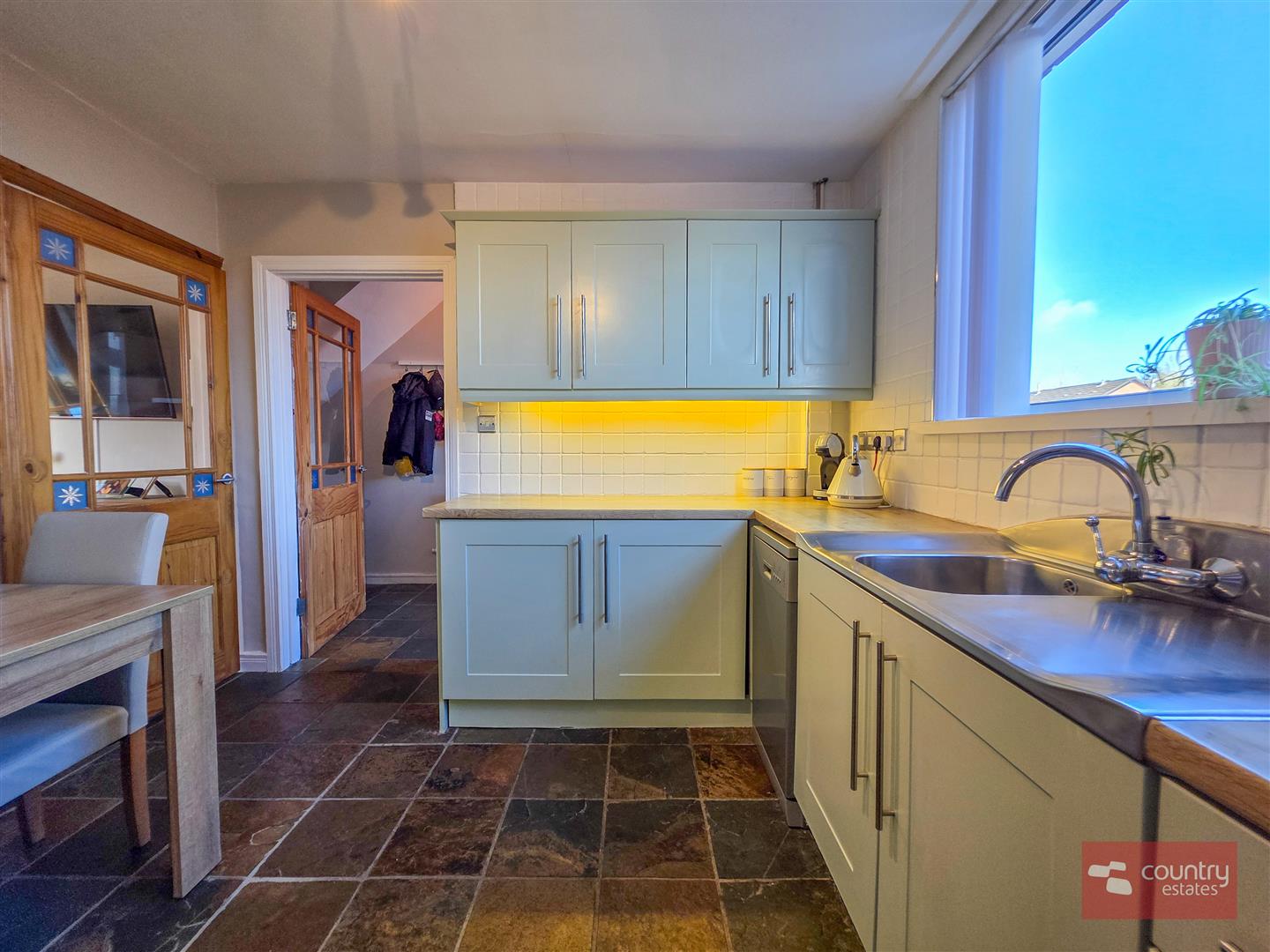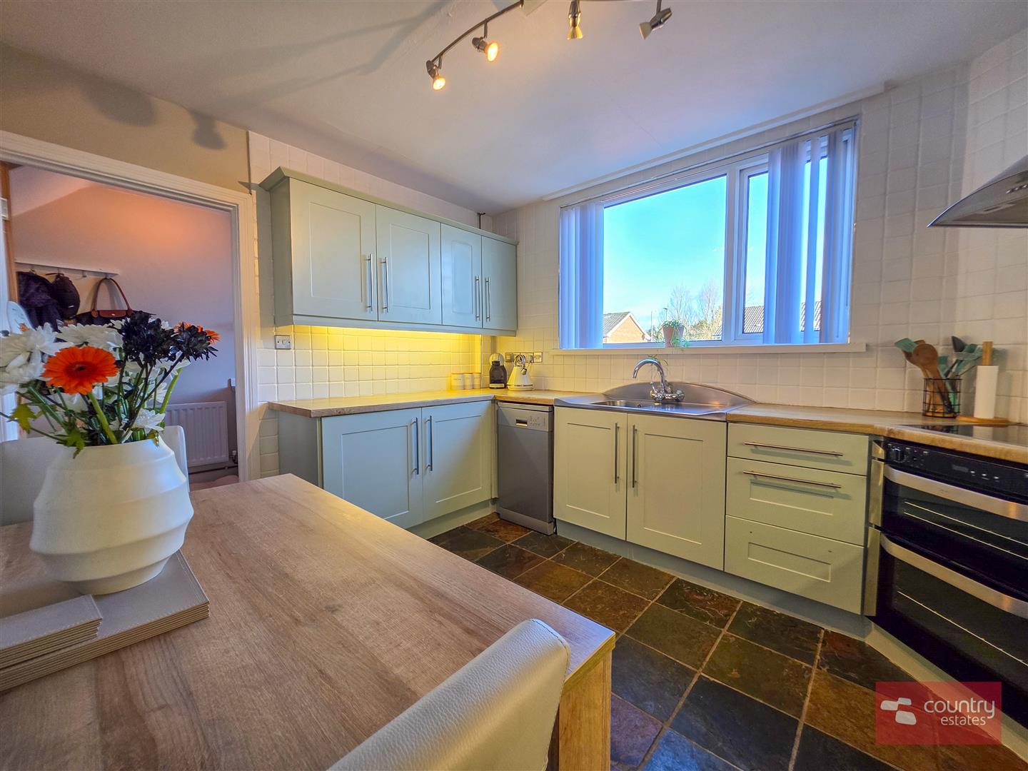 Equipped with a comprehensive range of high and low level shaker style fitted units with contrasting work surfaces. Single drainer stainless steel sink unit with swan neck mixer tap. Integrated oven with separate four ring electric hob and overhead extractor fan housed in stainless steel canopy. Integrated under counter fridge and freezer. Plumbed for dishwasher. Part tiled walls. Tiled floor.