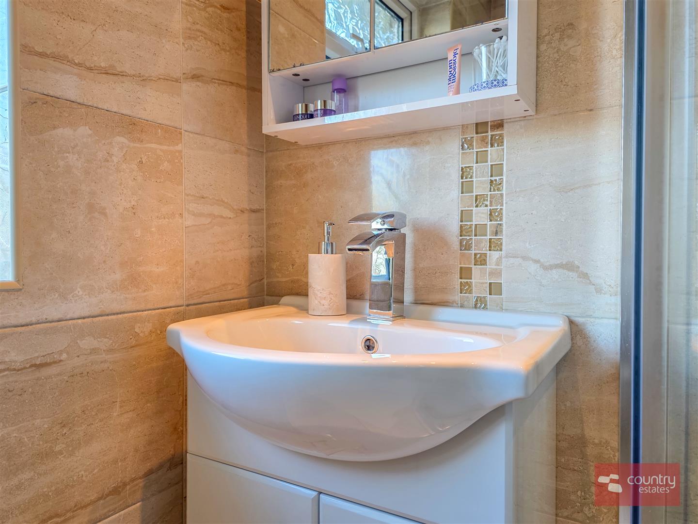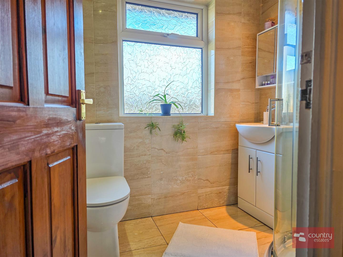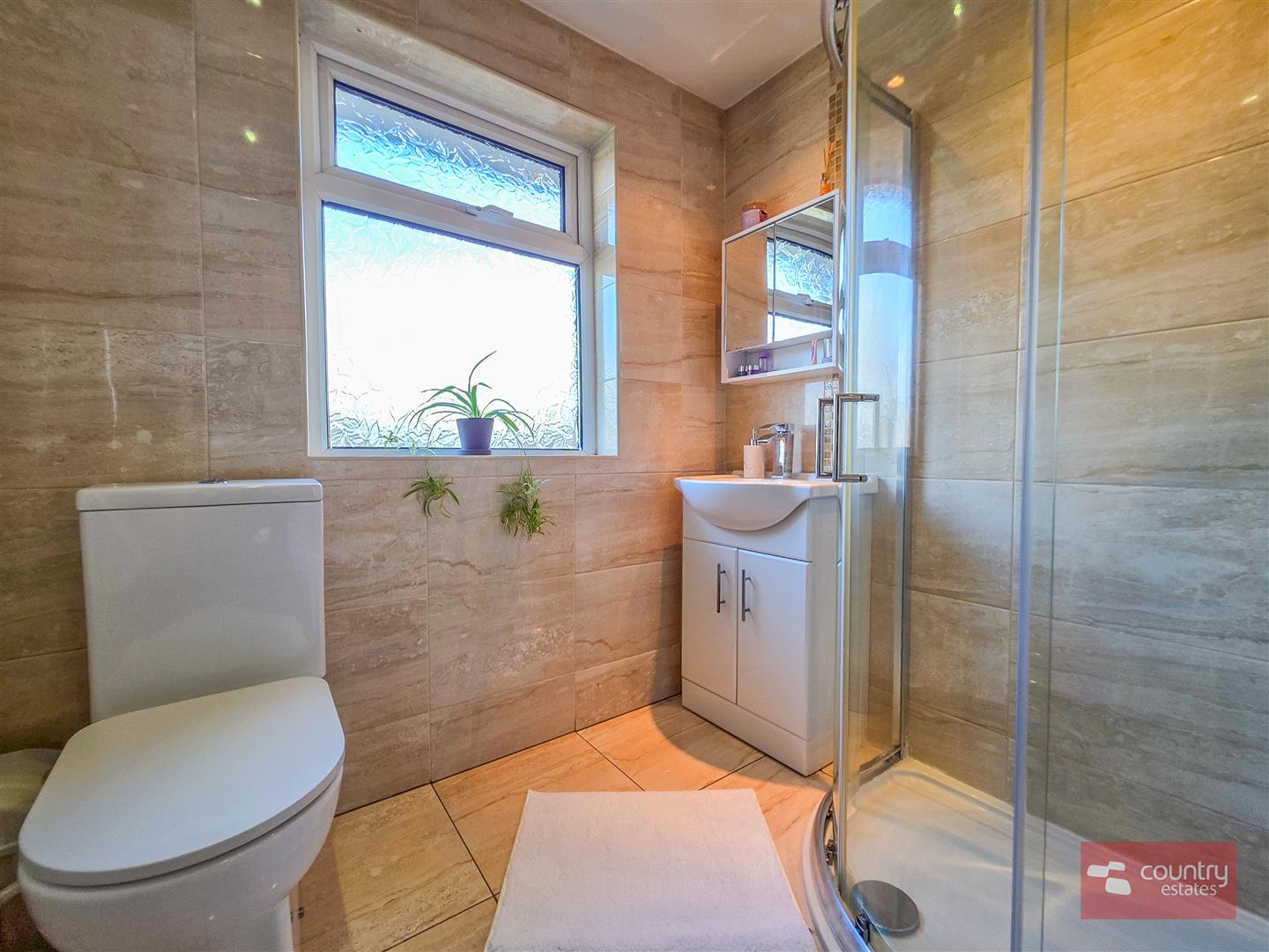 Comprising large quadrant shower cubicle with thermostatically controlled Drench style shower and hand shower attachment, wash hand basin in modern vanity unit with monobloc tap and button flush WC. Fully tiled walls. Tiled floor. Recessed down lighting. Chrome towel radiator.